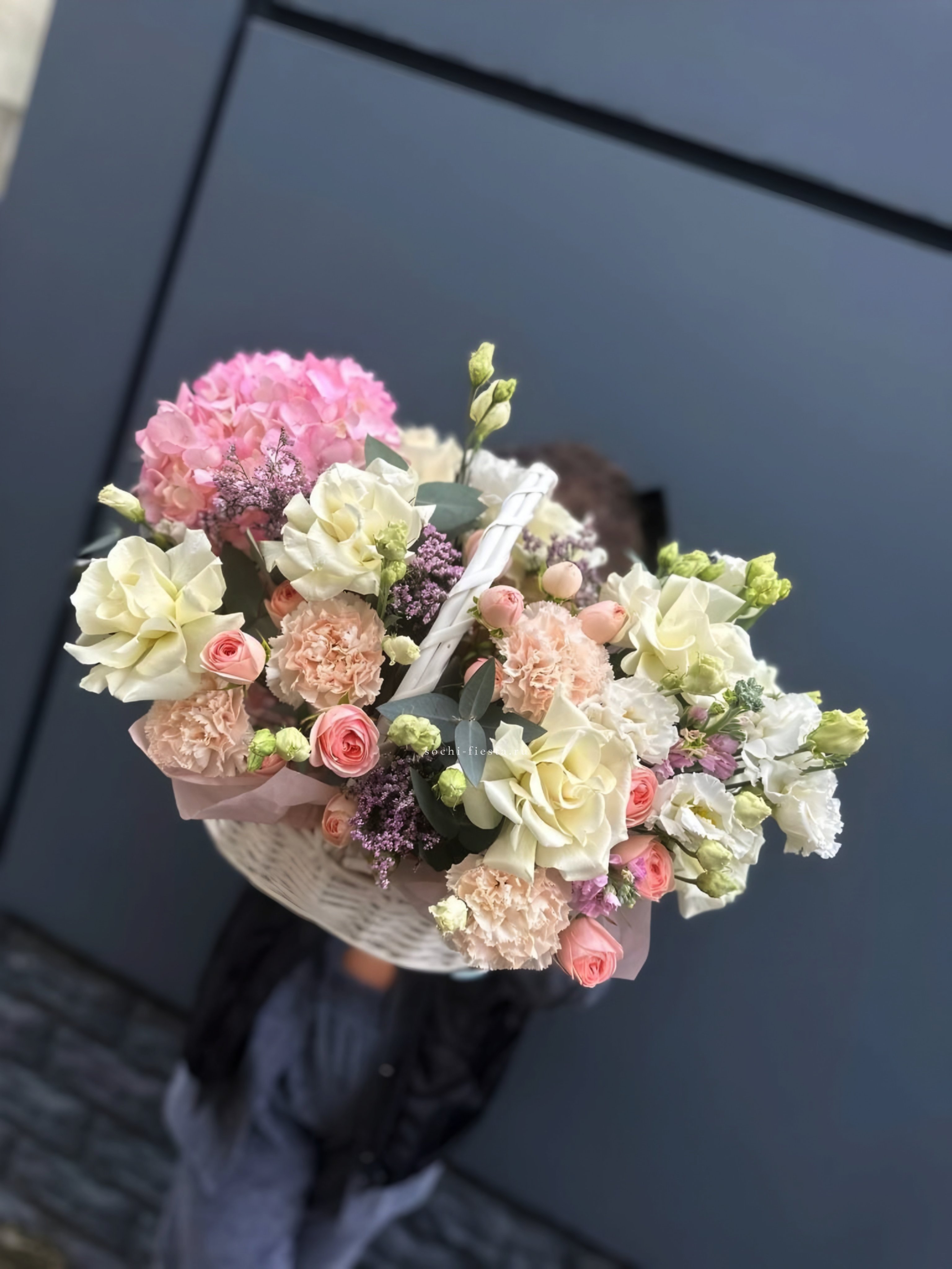 гербера, гортензия, диантус, хайди, эустома, эвкалипт, корзина средняя.