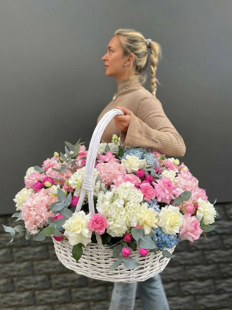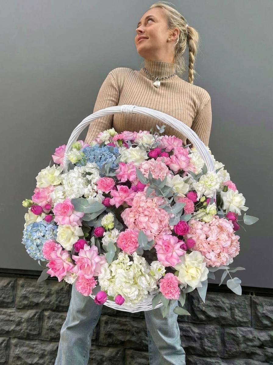 Гортензия и эустома задают объём, а яркие герберы расставляют цветовые акценты по всей композиции. Диантус и хайди добавляют воздушности, эвкалипт завершает силуэт мягкими линиями. Корзина держит форму и создаёт устойчивую основу для пышной композиции.
