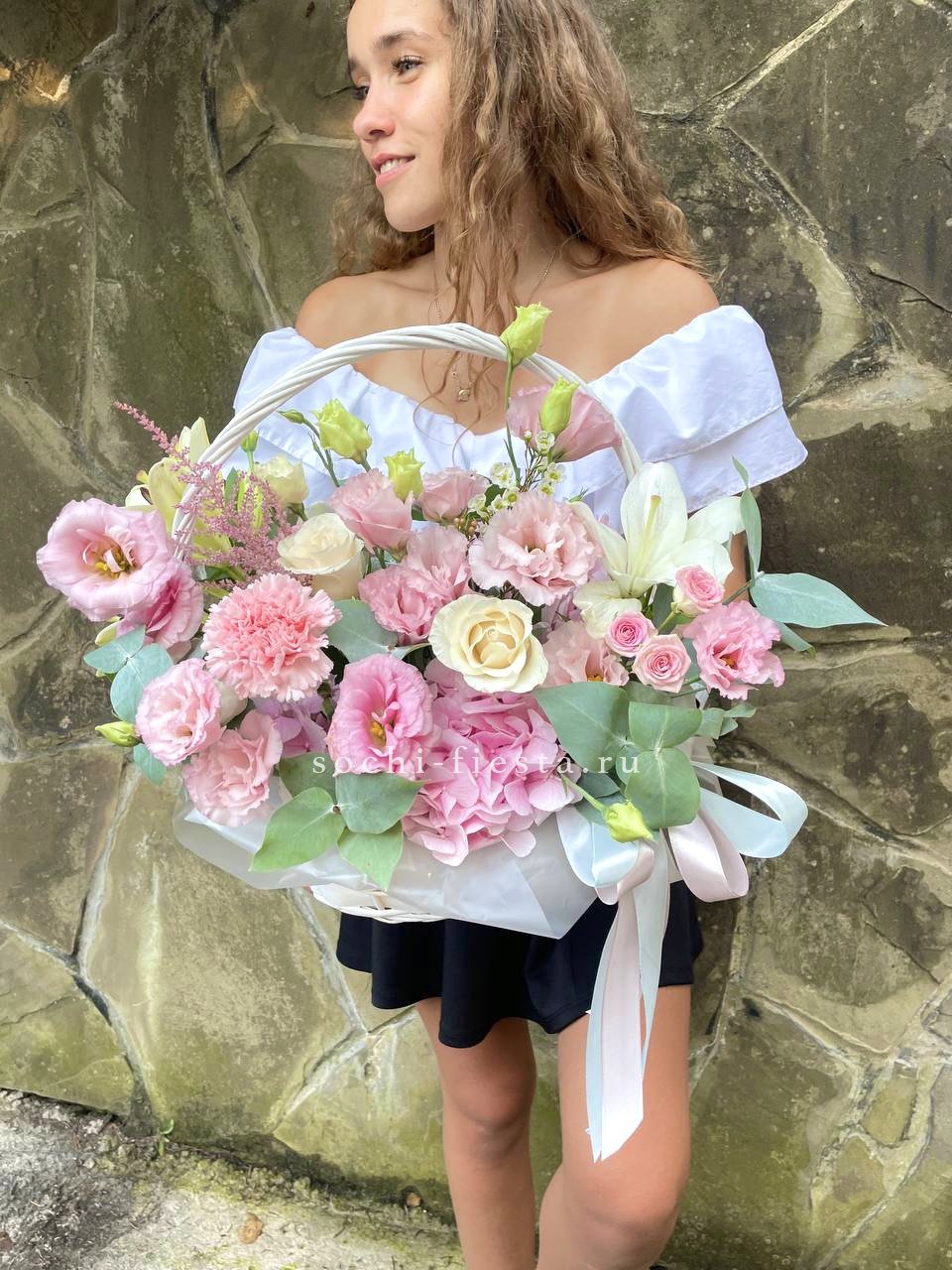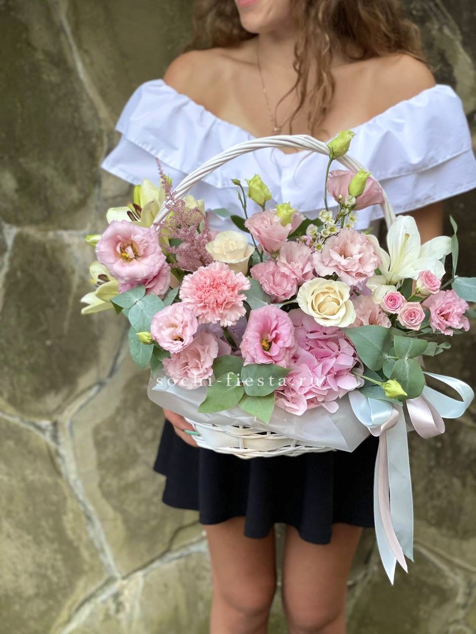 Диантусы создают воздушную текстуру, розы добавляют объем, а эустома раскрывается мягкими волнами. Композиция собрана в корзине и держит форму без лишних деталей.
