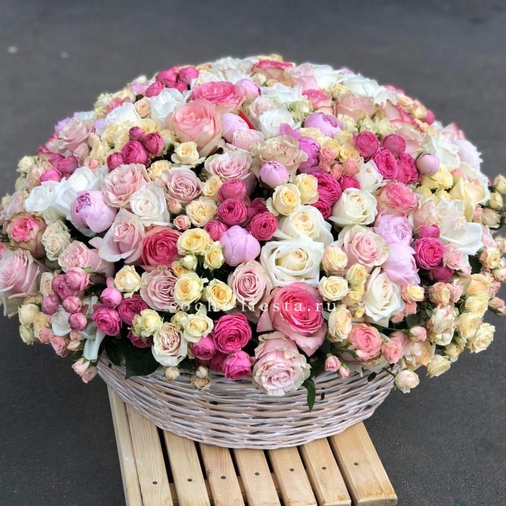 Воздушные соцветия эустомы собраны в округлую композицию с мягким переходом пастельных тонов. Светлая корзина создает легкую базу для объемной цветочной шапки.