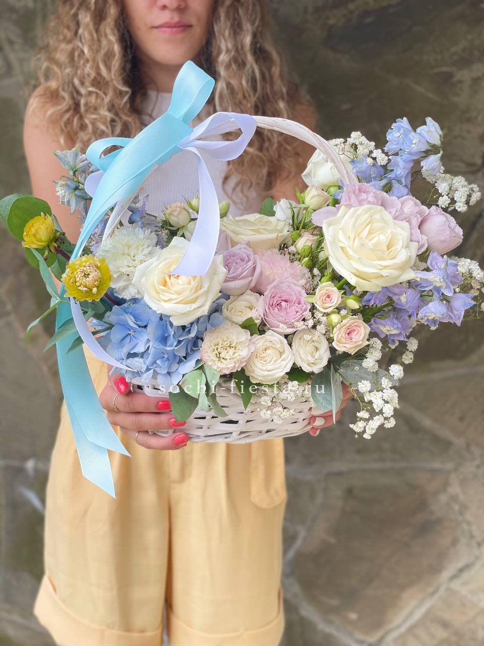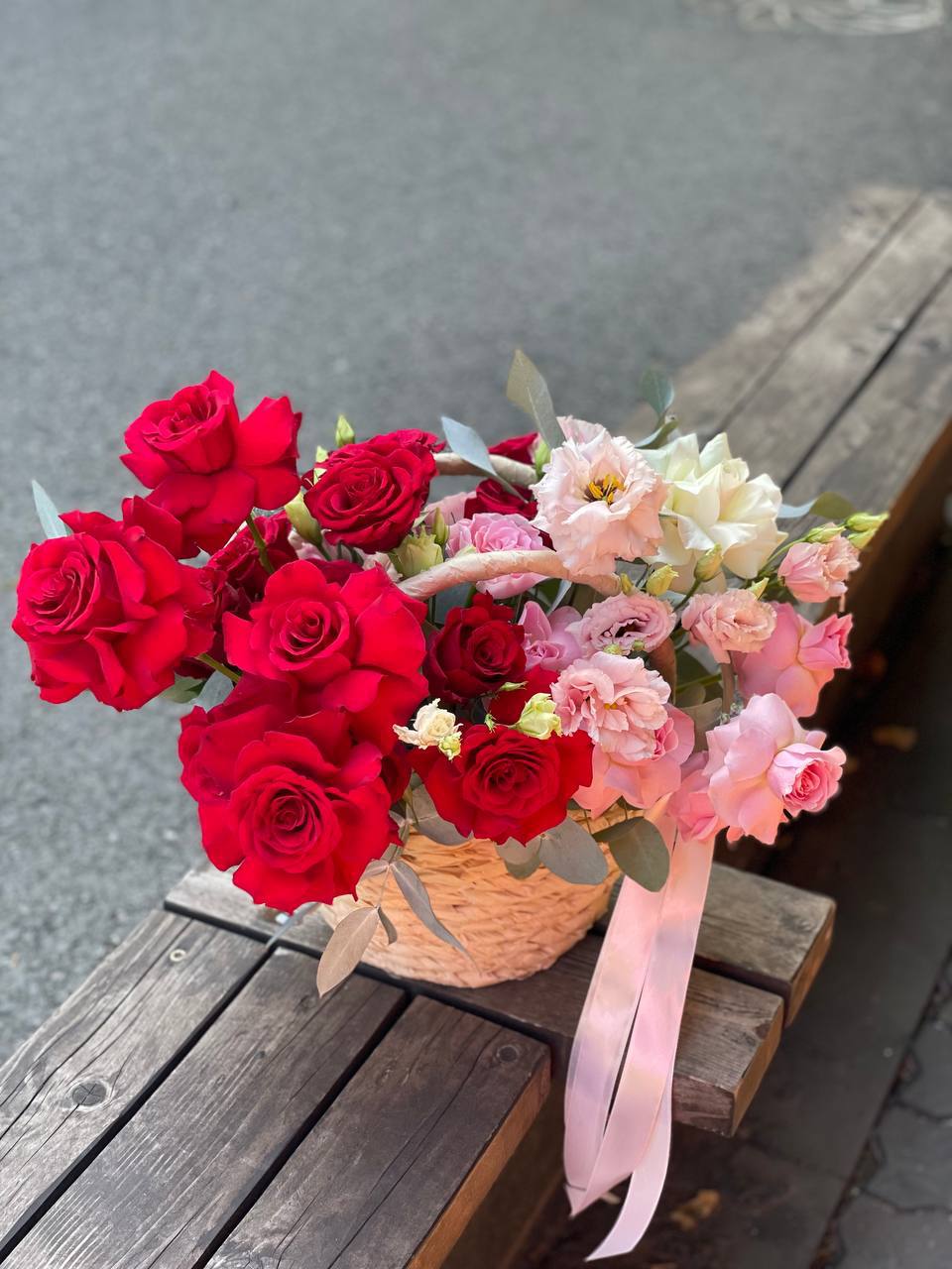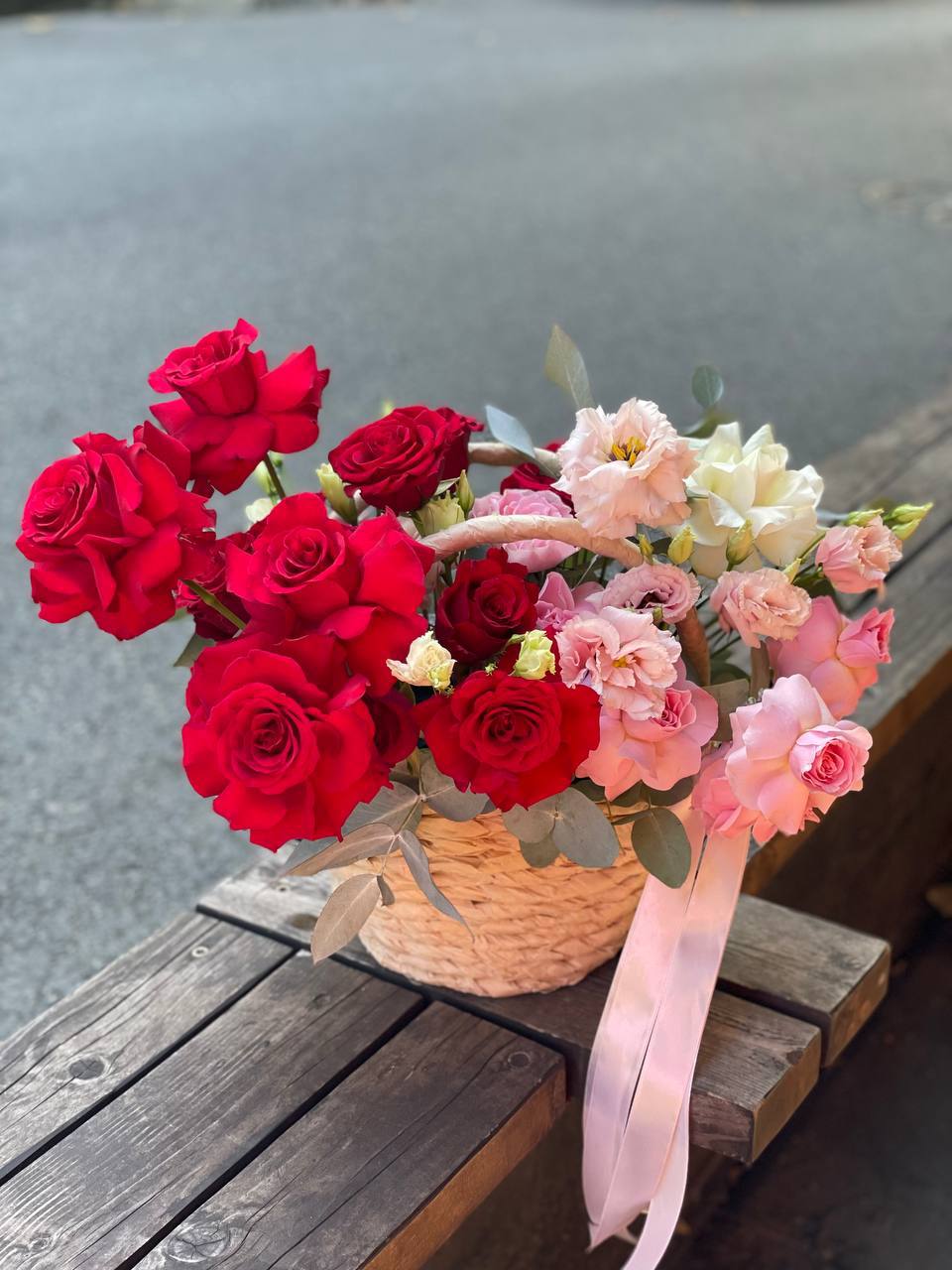 Плотная россыпь кустовых роз и эустомы создает живую текстуру с множеством мелких бутонов. Диантус добавляет воздушности, а эвкалипт собирает композицию в завершенную форму. Корзина позволяет разместить букет на столе без дополнительной вазы.