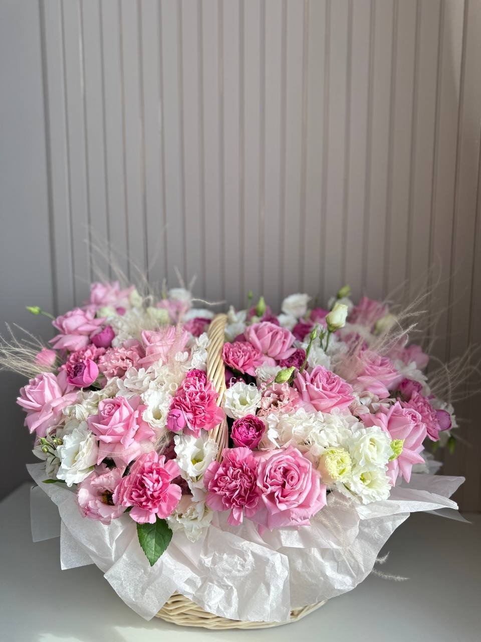 Пышная композиция в плетеной корзине объединяет розы, гортензию, эустому и дельфиниум в единую объемную форму. Маттиола и бомбастик добавляют воздушности, а эвкалипт создает мягкий природный фон. Корзина удобно располагается на любой поверхности и держит форму без дополнительной опоры.