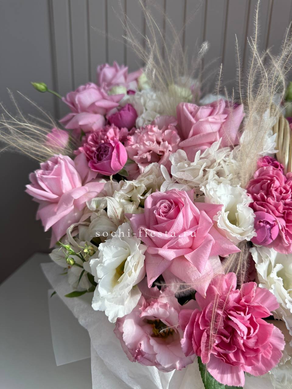 гортензия, бомбастик, эустома, розы одноголовые, дельфиниум (аналог вне сезона), маттиола, эвкалипт, лента, корзина D38.