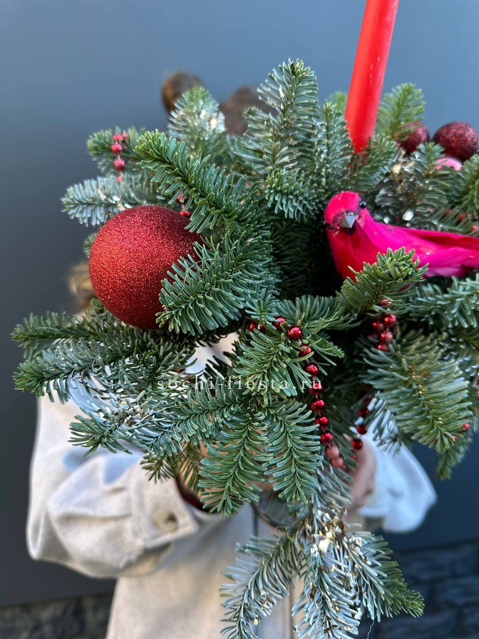 Свечи погружены в зелень нобилиса и окружены праздничными шарами. Композиция собрана в стеклянном бокале на флористическом оазисе. Завершённая форма для стола или камина.