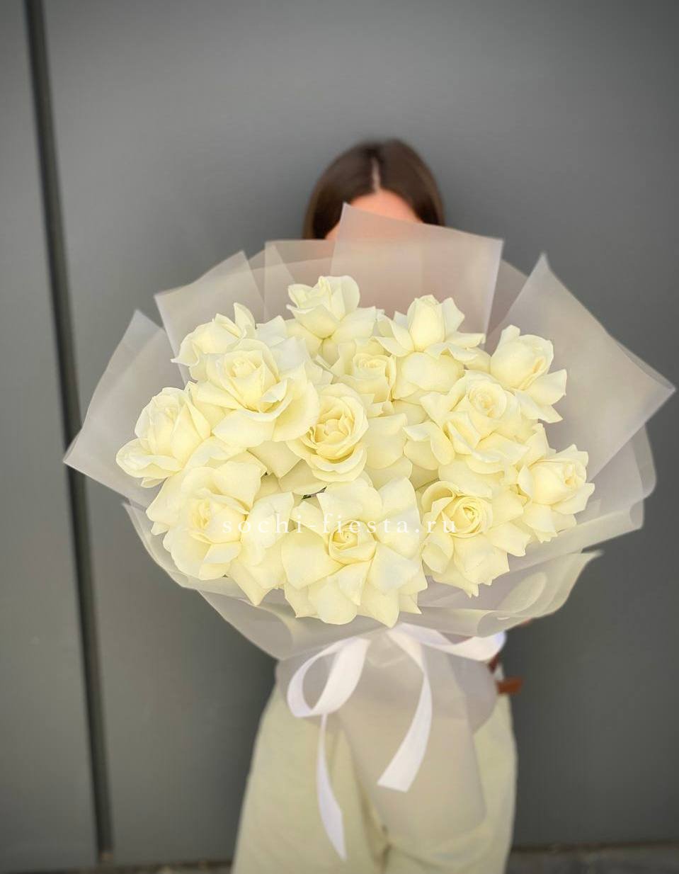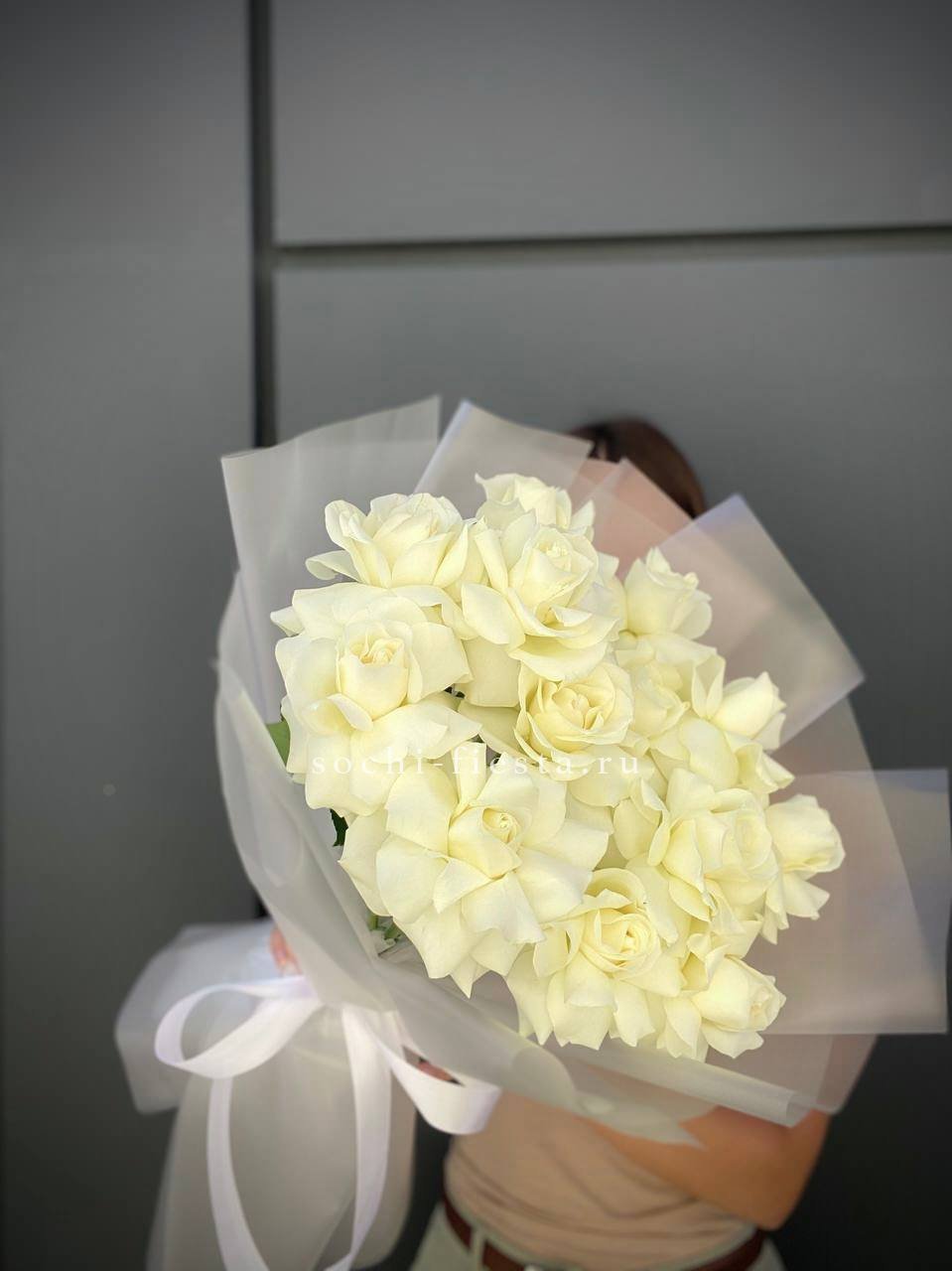 Тринадцать белоснежных бутонов собраны в компактную форму с ровным силуэтом. Букет легко размещается в вазе и сохраняет свежесть долгое время благодаря плотным лепесткам.