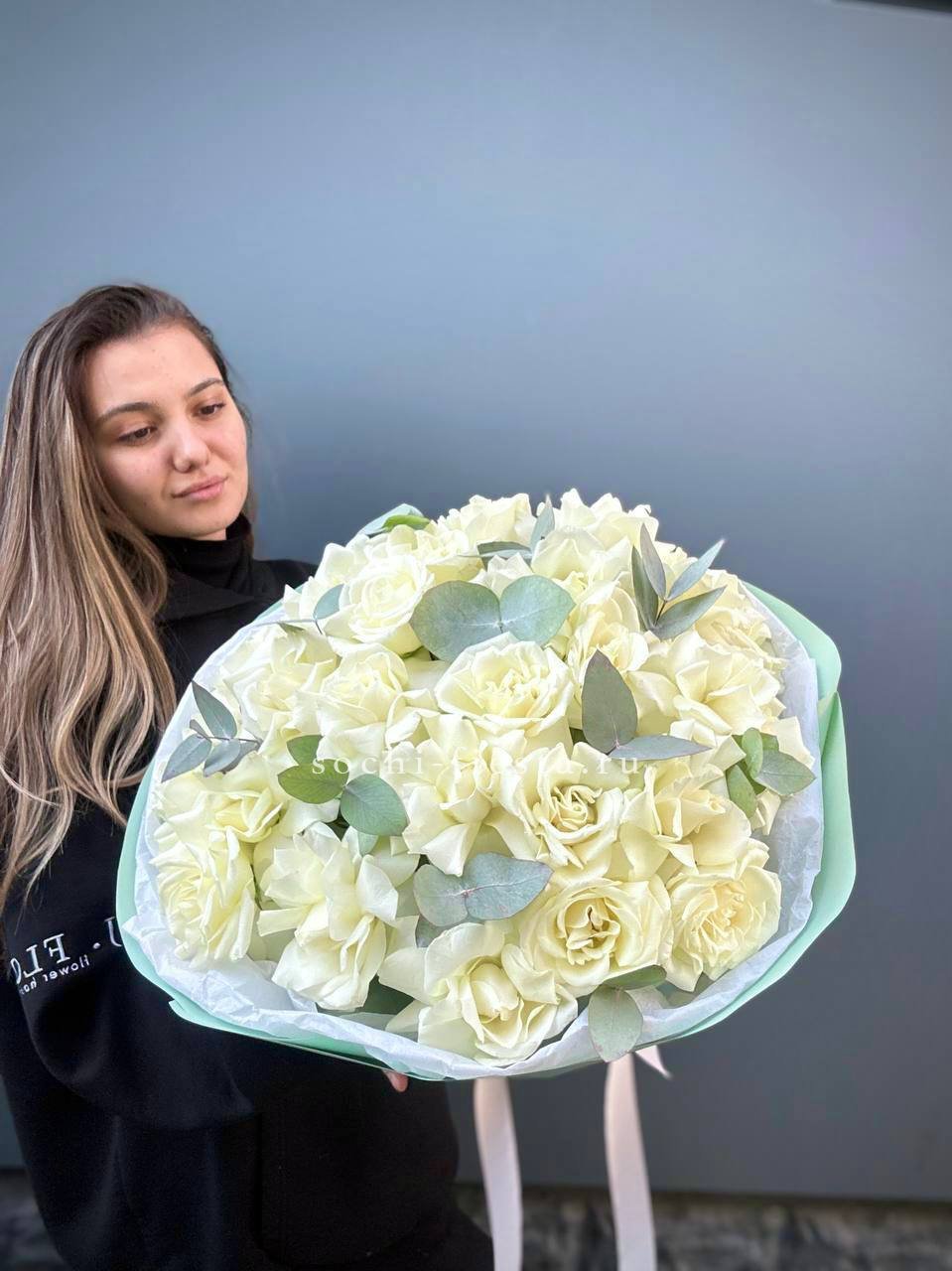 Вывернутые лепестки французских роз Notte Bianca раскрываются широко и создают объемную текстуру. Двадцать пять бутонов в окружении эвкалипта выглядят современно и графично.