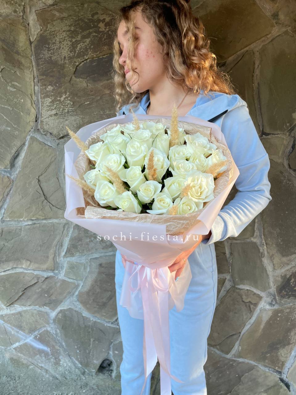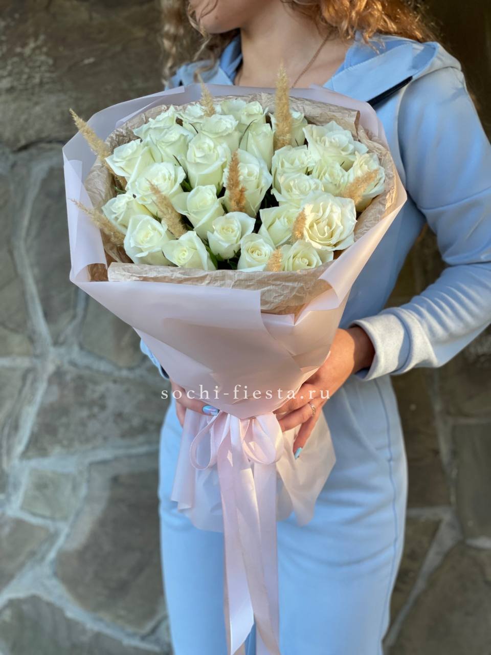 Тридцать один белый бутон формирует внушительную композицию, которая привлекает внимание своим присутствием. Букет выглядит цельно и заполняет собой любое пространство.