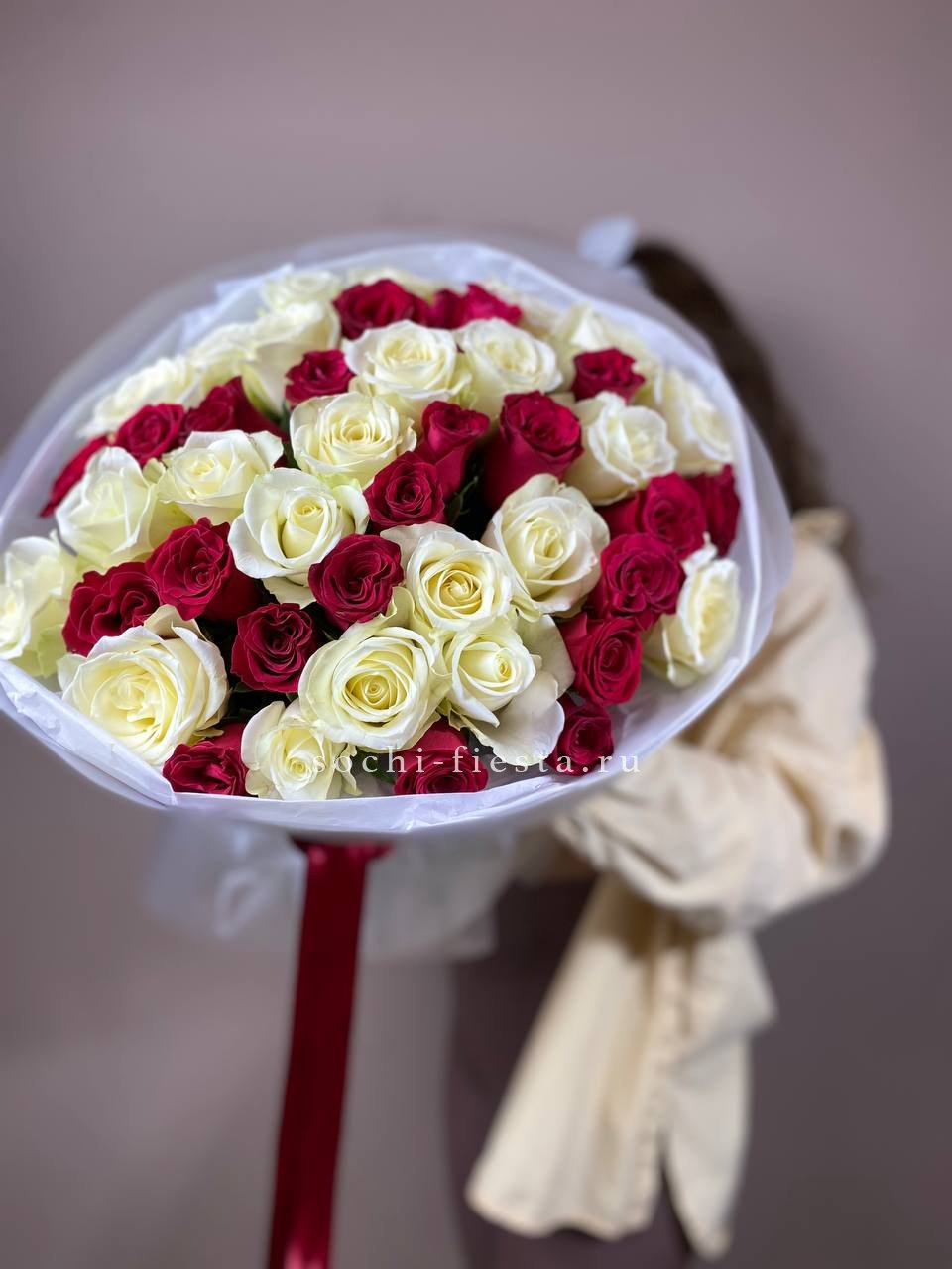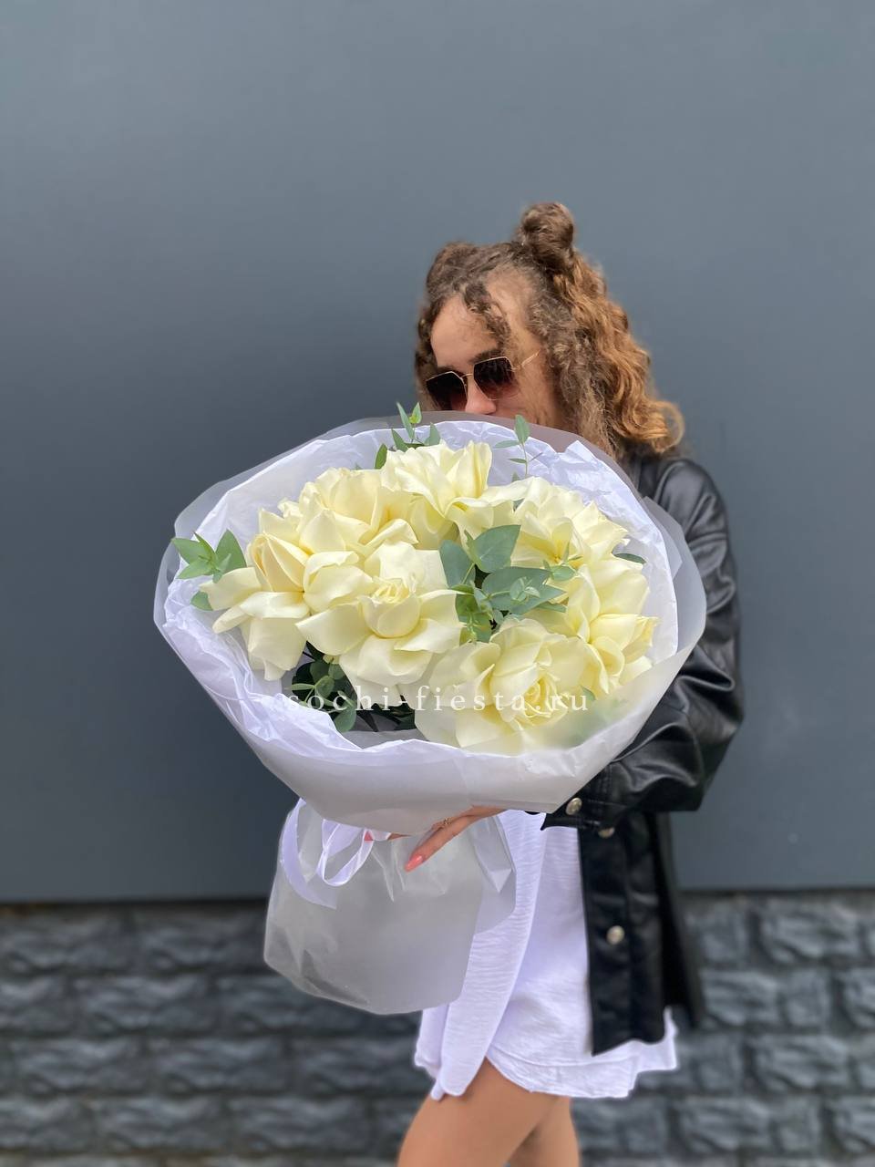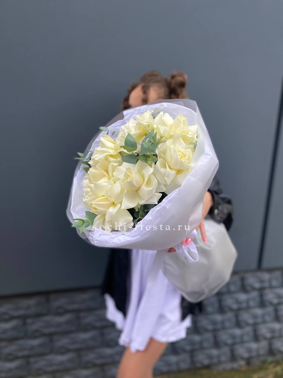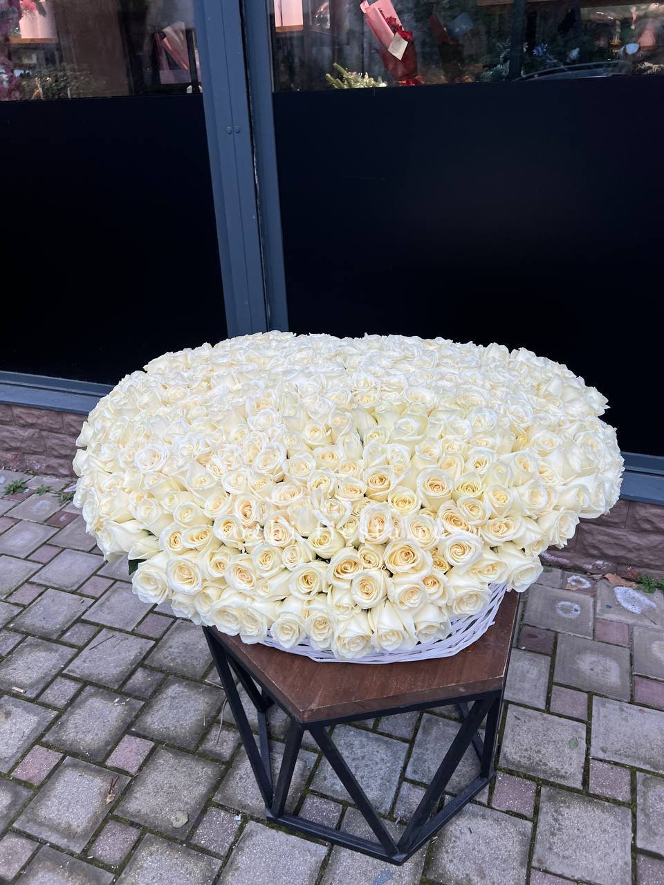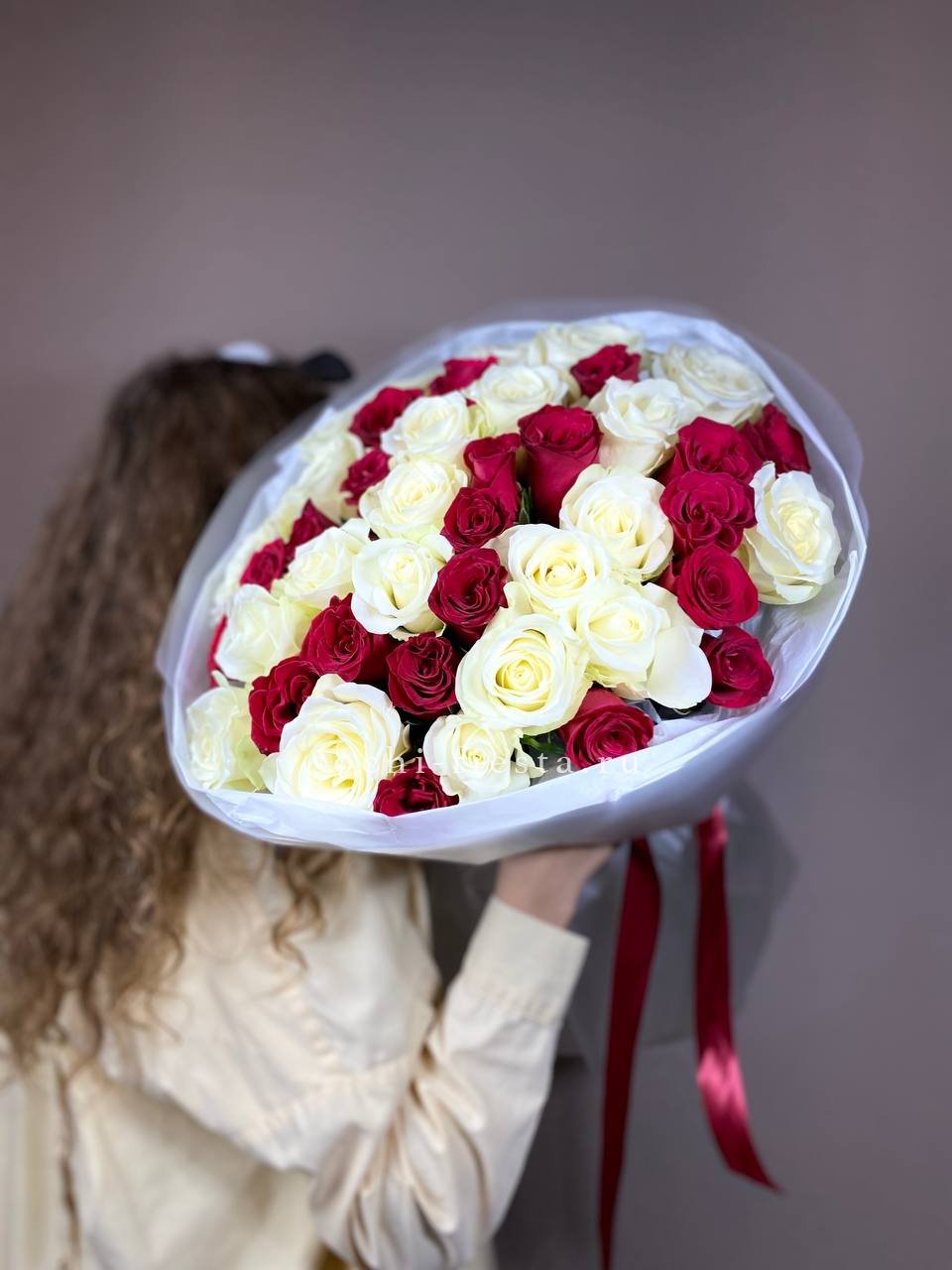 Пятьдесят один бутон выстраиваются в объёмную сферу с чёткой геометрией. Белые розы держат форму и создают ощутимое визуальное присутствие. Букет занимает пространство уверенно и спокойно.