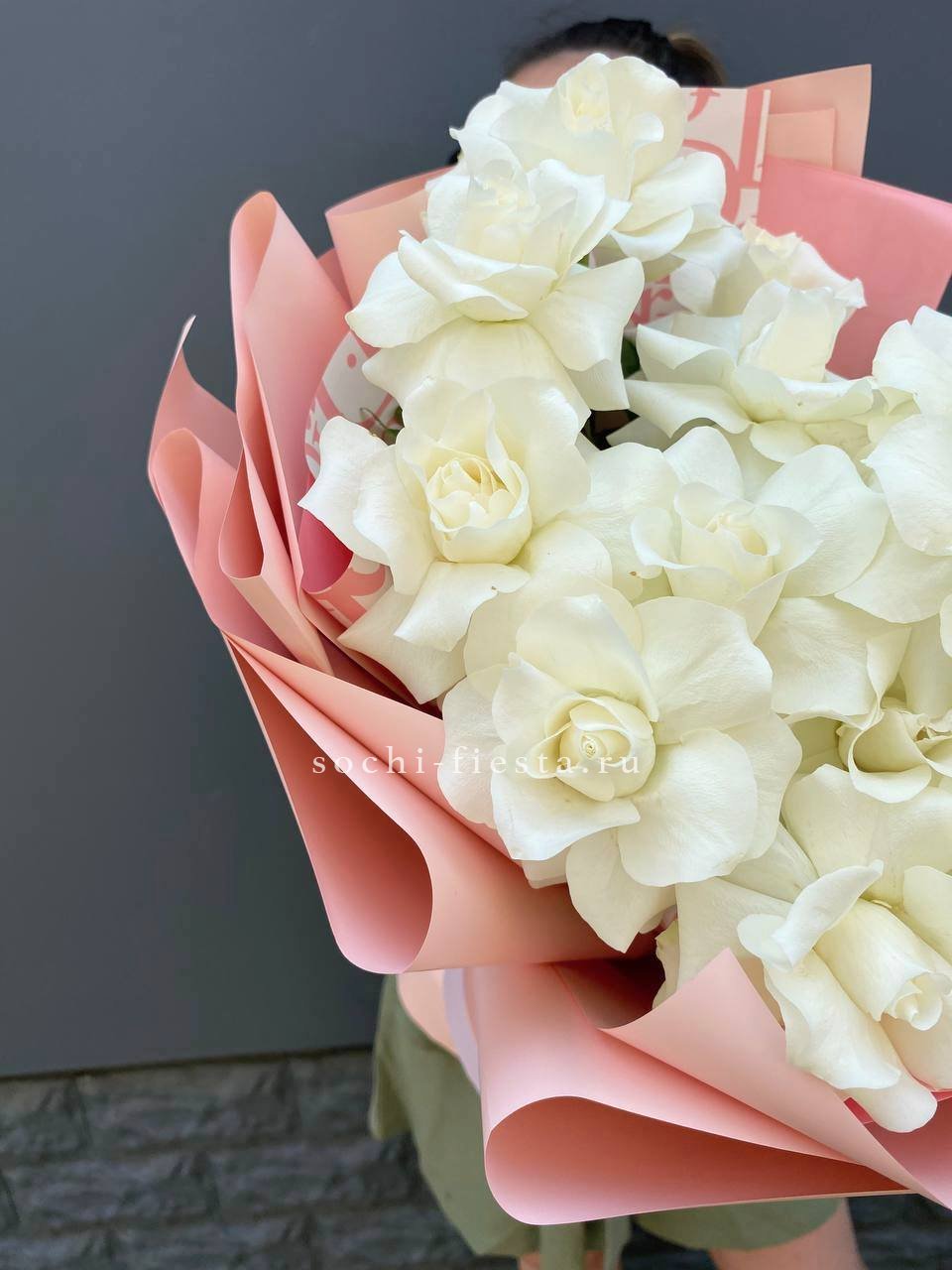 Пятнадцать белых роз собраны в плотный букет с чистыми линиями. Прозрачная упаковка сохраняет свежесть и открывает естественную красоту бутонов.