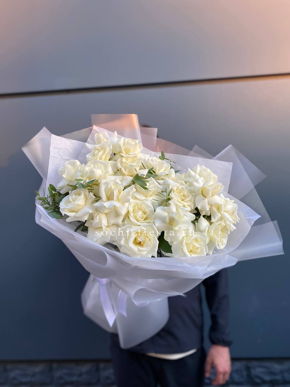 французские розы - 21 шт., эвкалипт - 2шт., лента, авторская упаковка.
