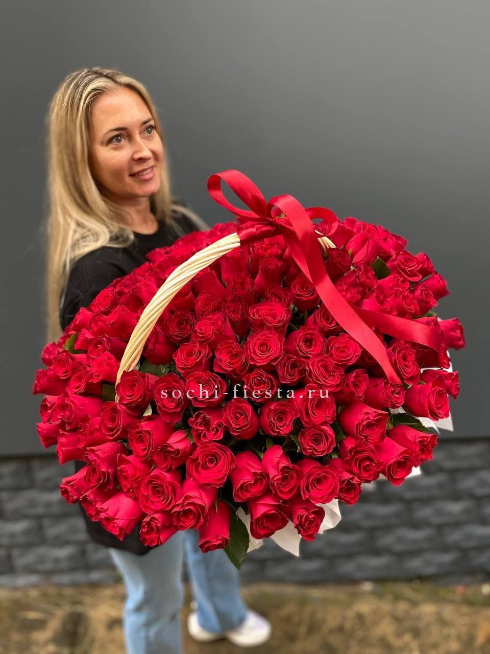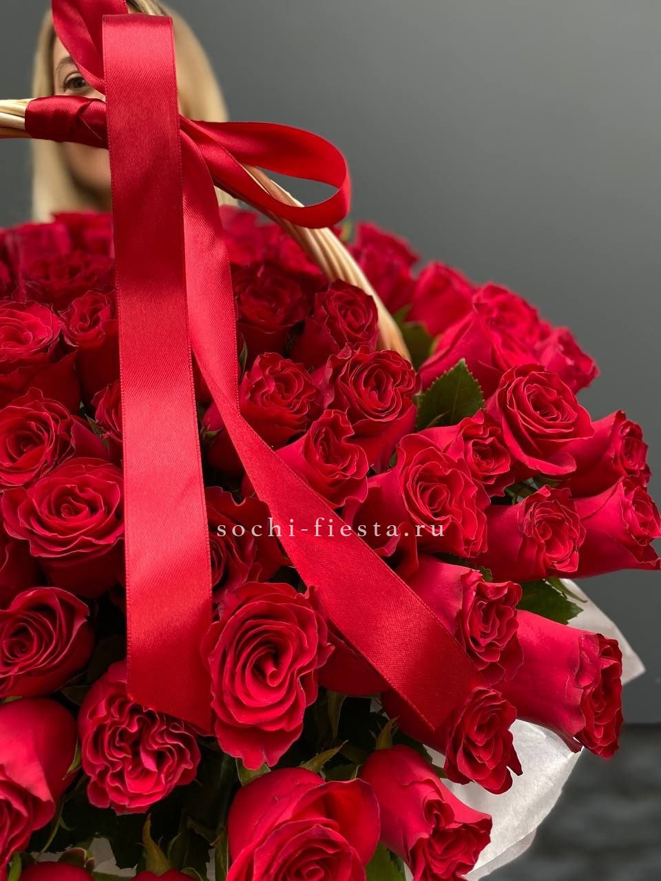 Полтора сотни алых бутонов собраны в плетёную корзину и образуют плотную цветочную поверхность. Красный цвет заполняет пространство и удерживает внимание. Такая композиция говорит сама за себя.
