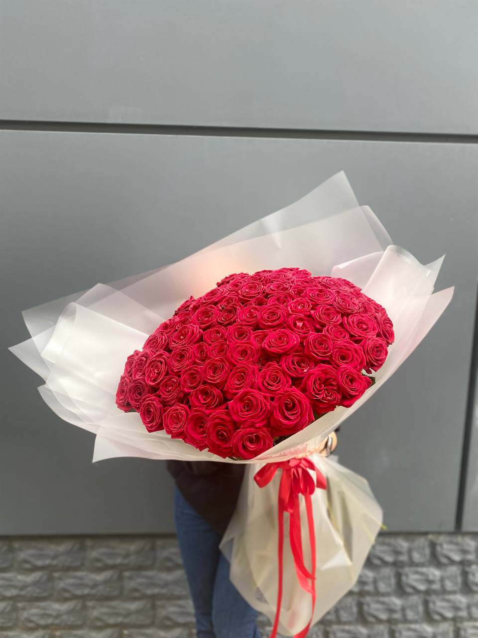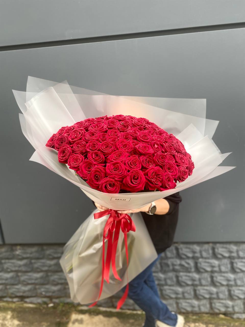 Яркие красные головки роз привлекают взгляд и удерживают его. Цвет насыщенный и живой, букет выглядит выразительно в любом освещении.
