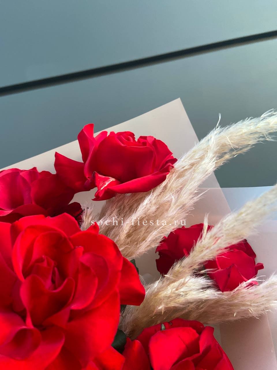 Вывернутые лепестки французских роз раскрываются широко и создают объёмную текстуру. Пампасная трава добавляет воздушности и смягчает линии. Пятнадцать бутонов в авторской упаковке выглядят свежо и современно.