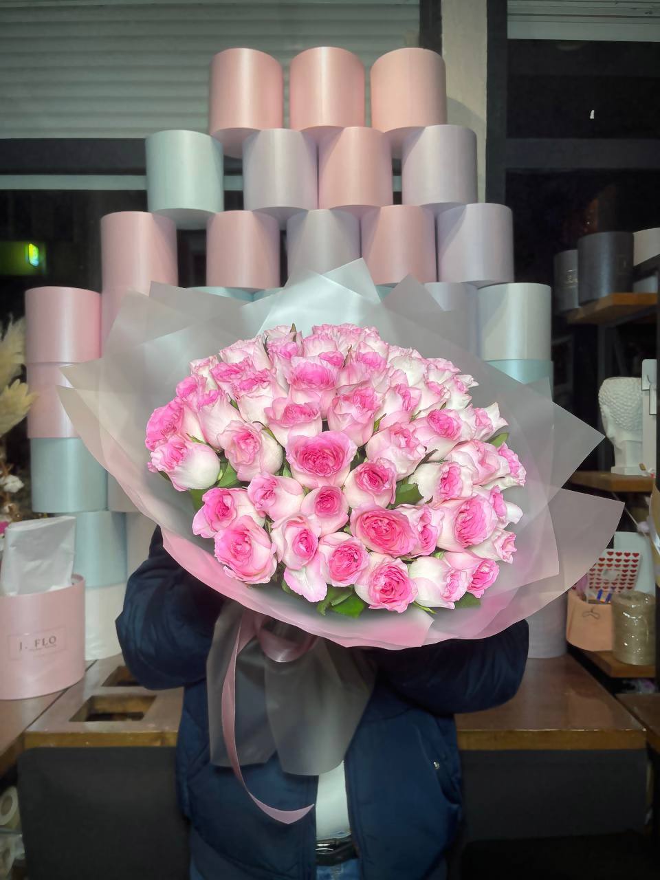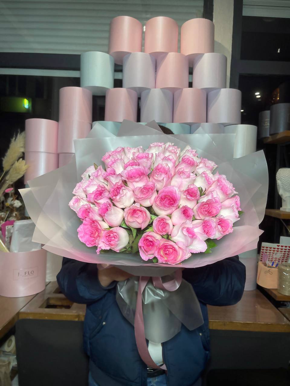 Сто одна роза пудрово-розового оттенка образует монохромное облако из бутонов. Классическая форма в современной подаче для тех, кто предпочитает говорить цветом без лишних слов.