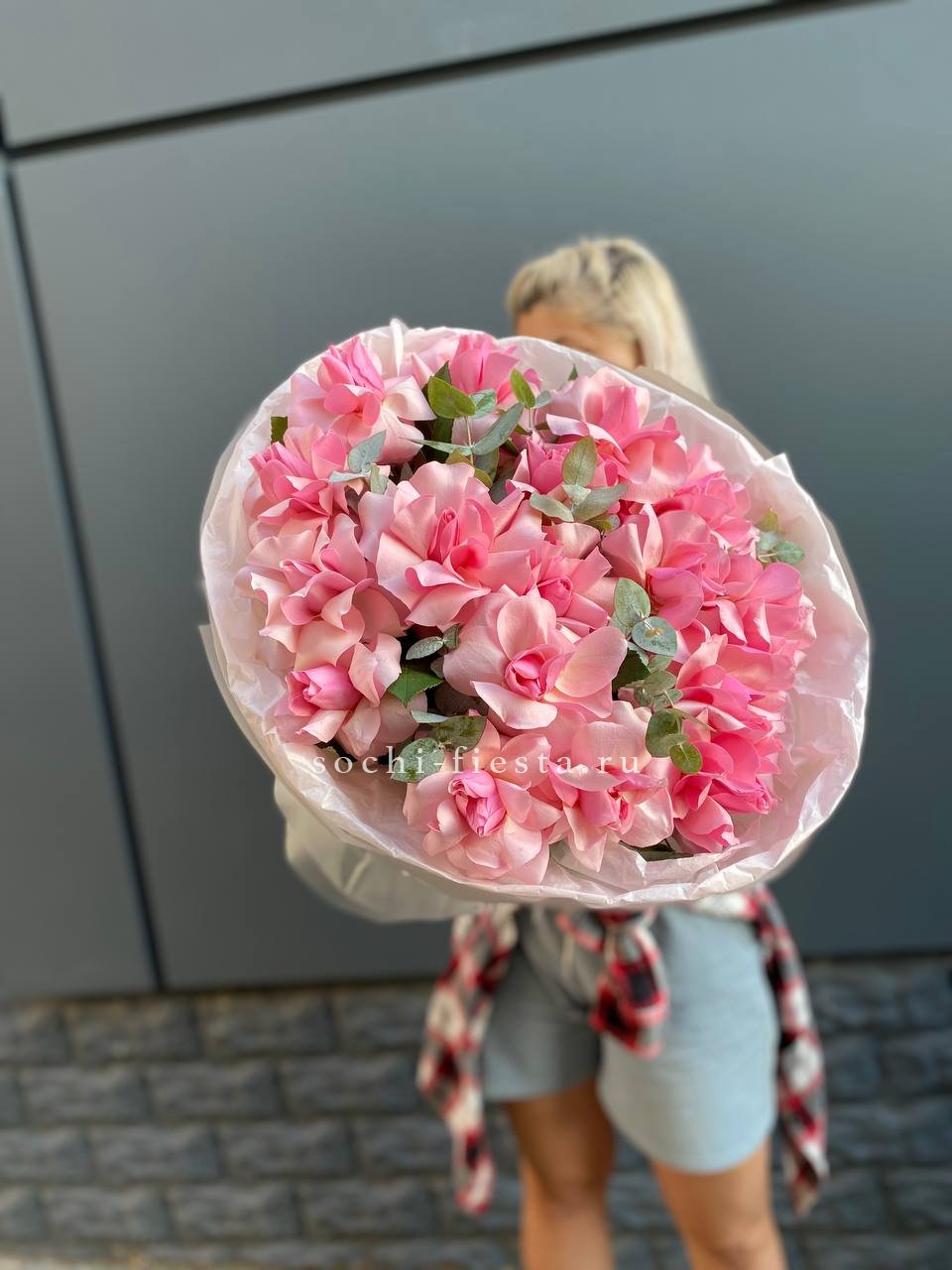 Семнадцать бутонов создают пышный объём и уверенное присутствие в любом пространстве. Розовый тон дополнен матовой зеленью эвкалипта. Букет держит форму и остаётся свежим долгое время.