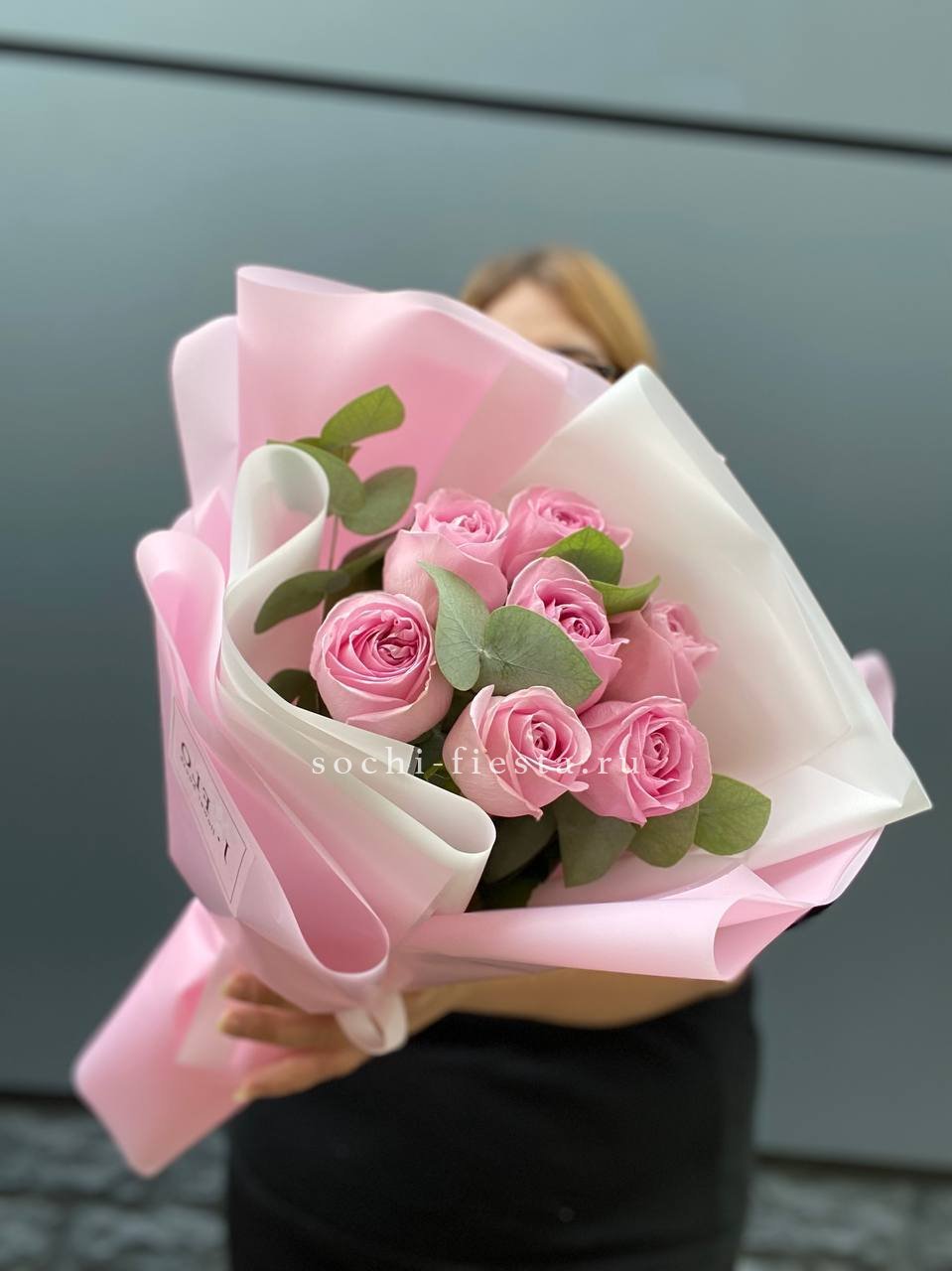 Для заказа товара "7 розовых роз с эвкалиптом" с доставкой в Северодвинске нажмите в корзину