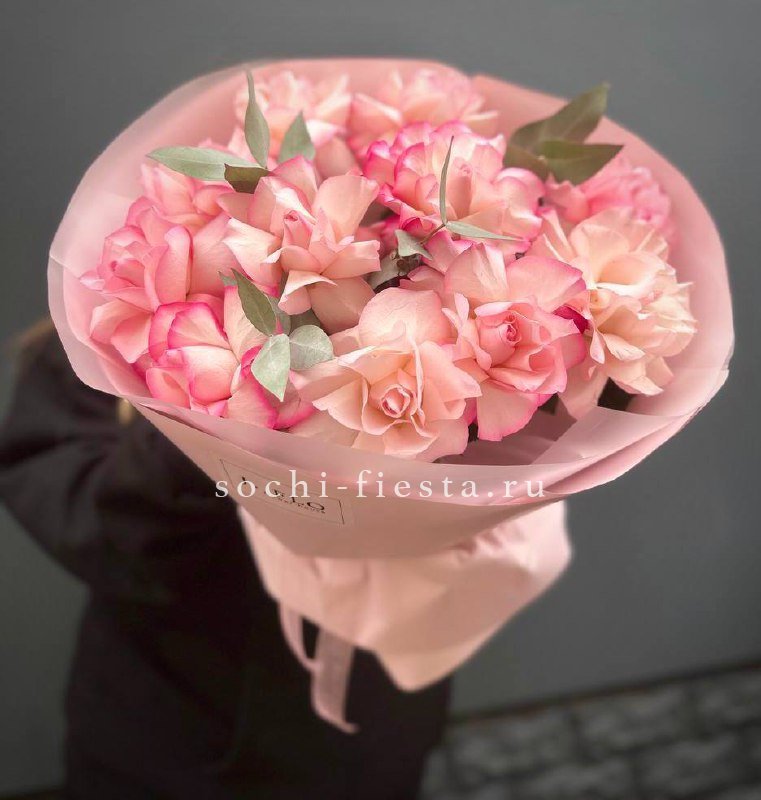 французские розы - 11 шт., эвкалипт - 1шт., лента, авторская упаковка.