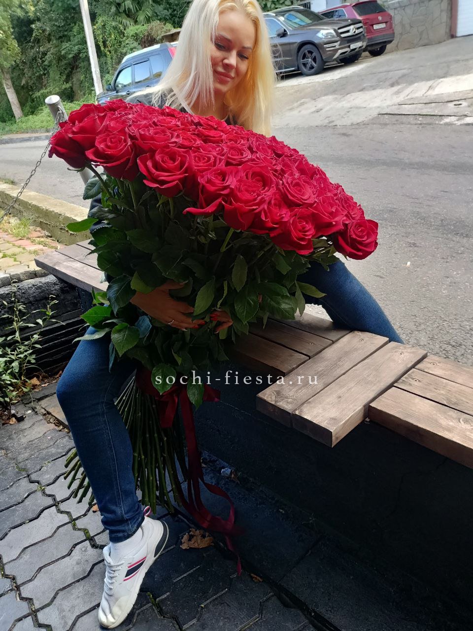 Сто одна роза в плотной охапке создает объемное облако цвета и движения. Розовый оттенок наполняет пространство мягким свечением, а высота букета позволяет ему доминировать в любом интерьере.