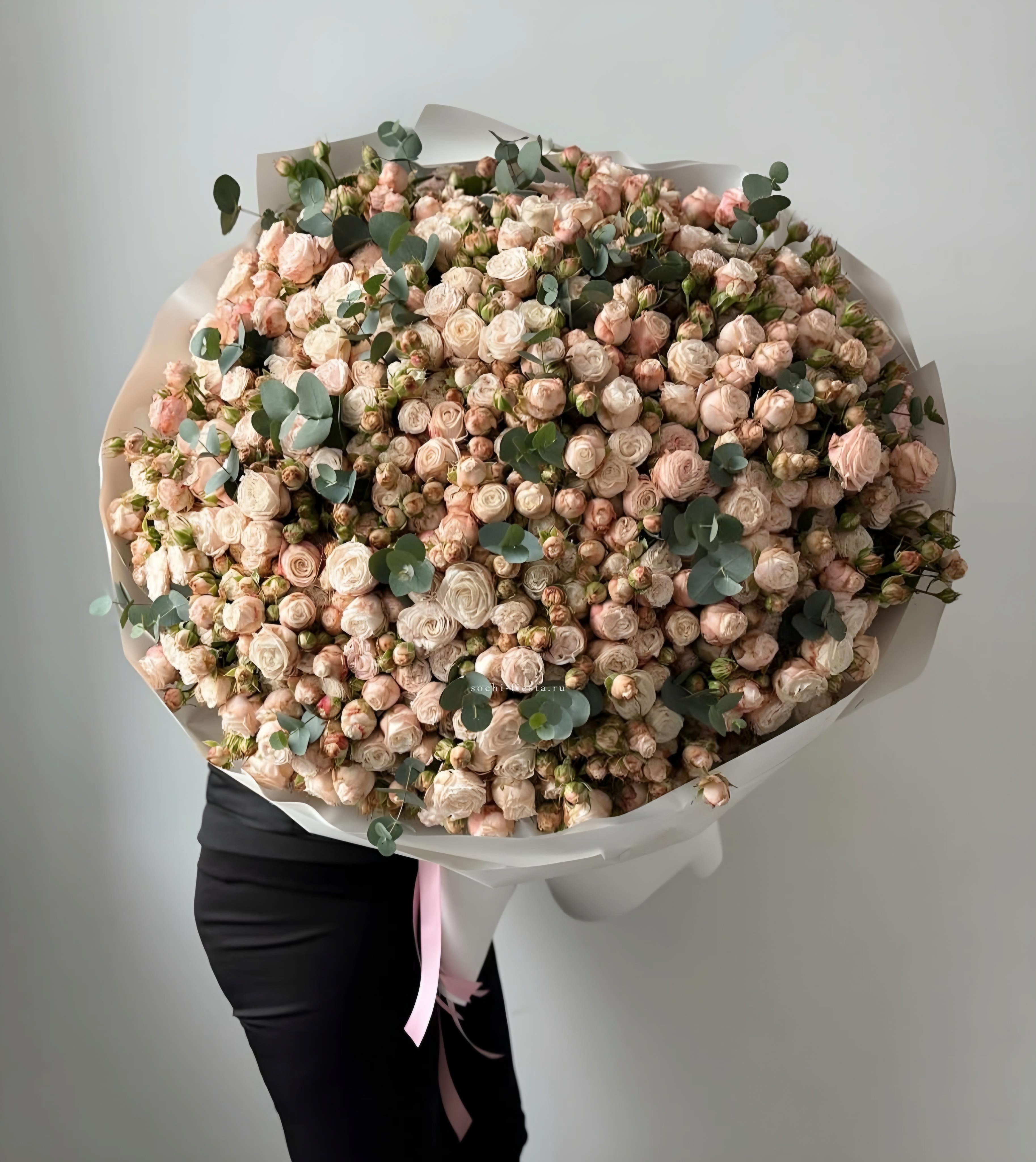 Одиннадцать пионовидных роз Бомбастик с густыми многослойными бутонами создают плотную округлую форму. Каждый цветок раскрыт почти полностью, демонстрируя фактурную глубину лепестков и мягкую игру светлых оттенков.