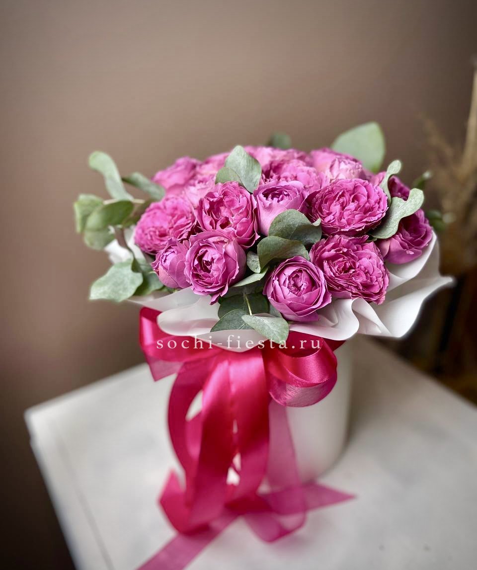 кустовая роза - 19 шт., эвкалипт, лента, дизайнерская упаковка.