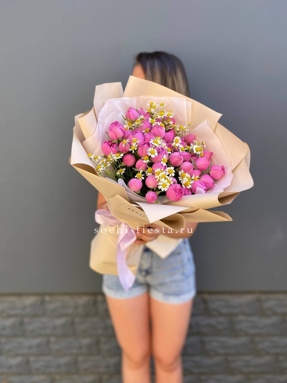 кустовые розы мисти бабблс, ромашки, лента, упаковка.