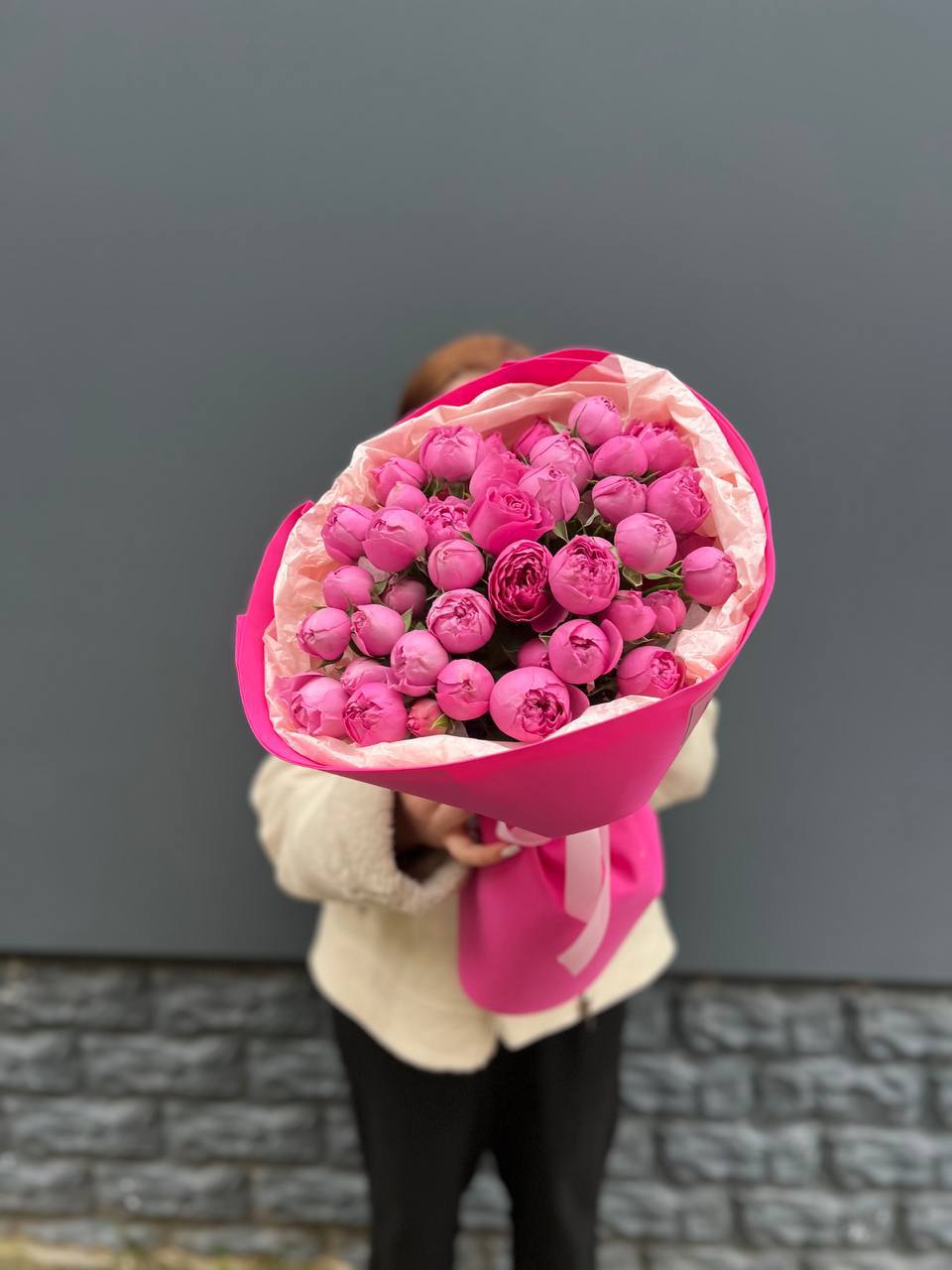 19 веток  пионовидных роз мисти баблс, лента, дизайнерская упаковка.