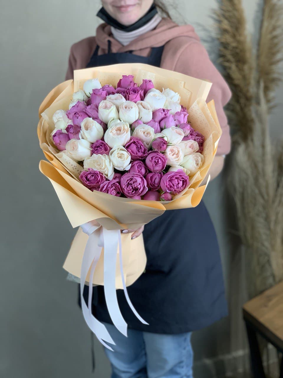 пионовидная кустовая роза Мисти Баблс - 51 шт., эвкалипт 5 шт., хаммелациум (или аналог), лента, дизайнерская упаковка.