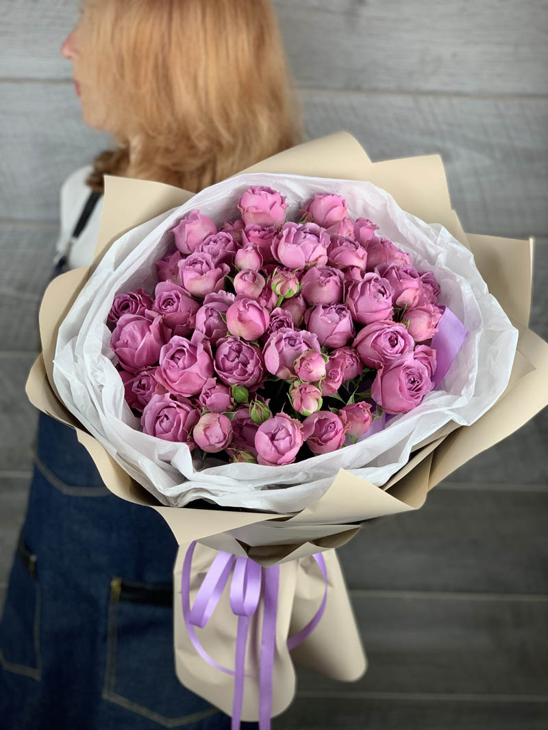 Пятьдесят одна ветка пионовидных кустовых роз Мисти Баблс дополнена эвкалиптом и хаммелациумом. Многослойные бутоны раскрываются пышными шапками в лавандово-розовой гамме. Воздушная зелень добавляет движение и свежесть всей композиции.