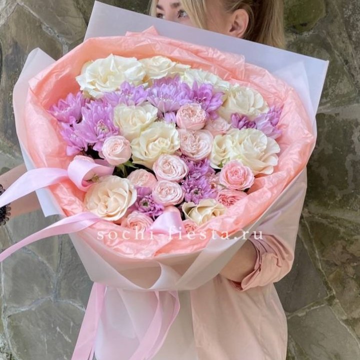 Основа сборных букетов в Северодвинске: розы (Freedom, Mondial, Avalanche), хризантема кустовая, альстромерия, эустома, фрезия, вероника. Дополнительно — ранункулюсы в сезон, хризантема одиночная, ирис весной, тюльпаны в апреле. Состав зависит от текущей поставки и сезона. Флорист всегда предлагает то, что в лучшей форме прямо сейчас.
