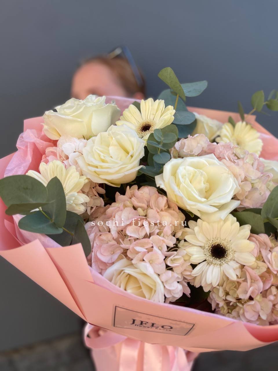 Герберы задают открытый характер букета, розы добавляют мягкости, а гортензия наполняет объёмом. Композиция смотрится свежо и держит форму без усилий.