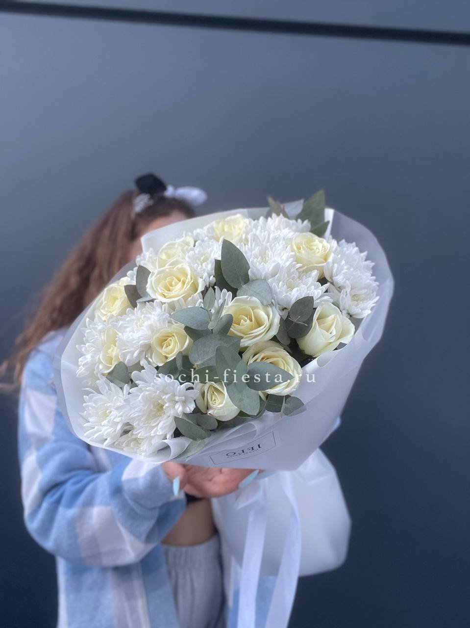 хризантема кустовая, белые розы, эвкалипт, лента, дизайнерская пленка.