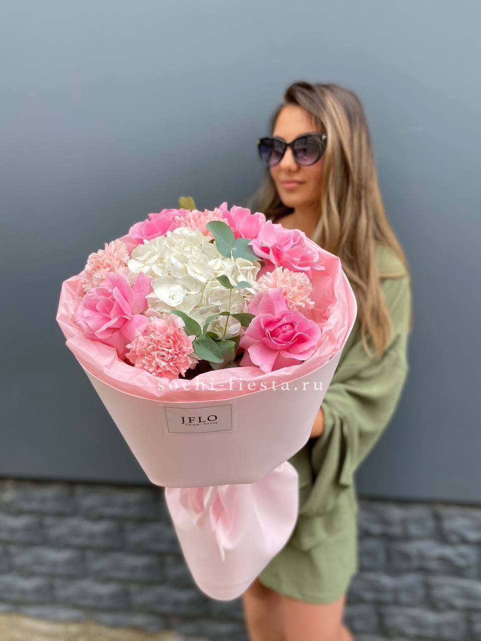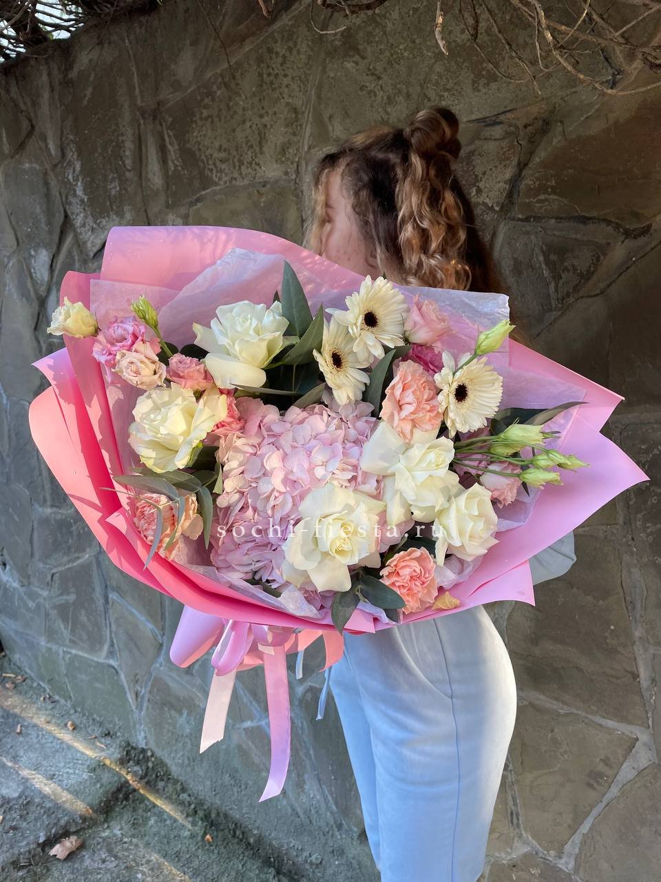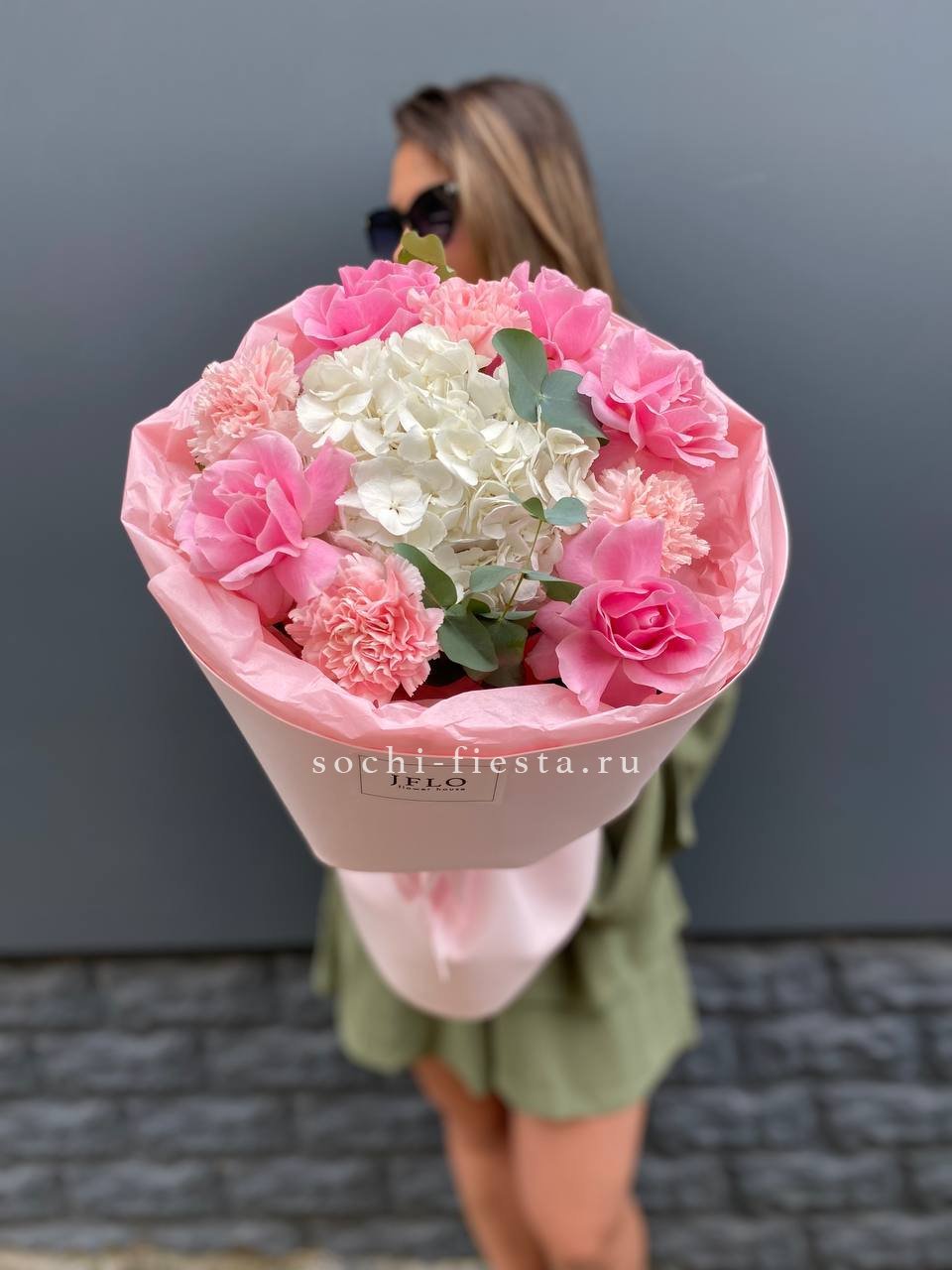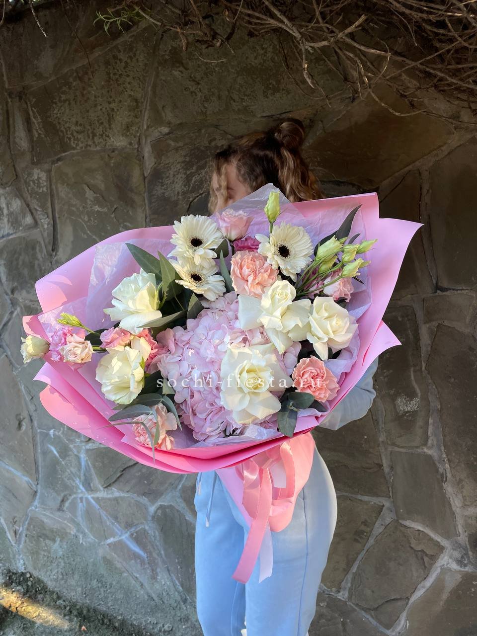 гортензия, роза, эустома, бомбастик,  эвкалипт, лента, дизайнерская пленка.