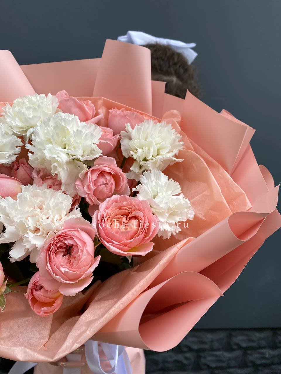кустовые розы Джульетта и диантусы в нежном оформлении.