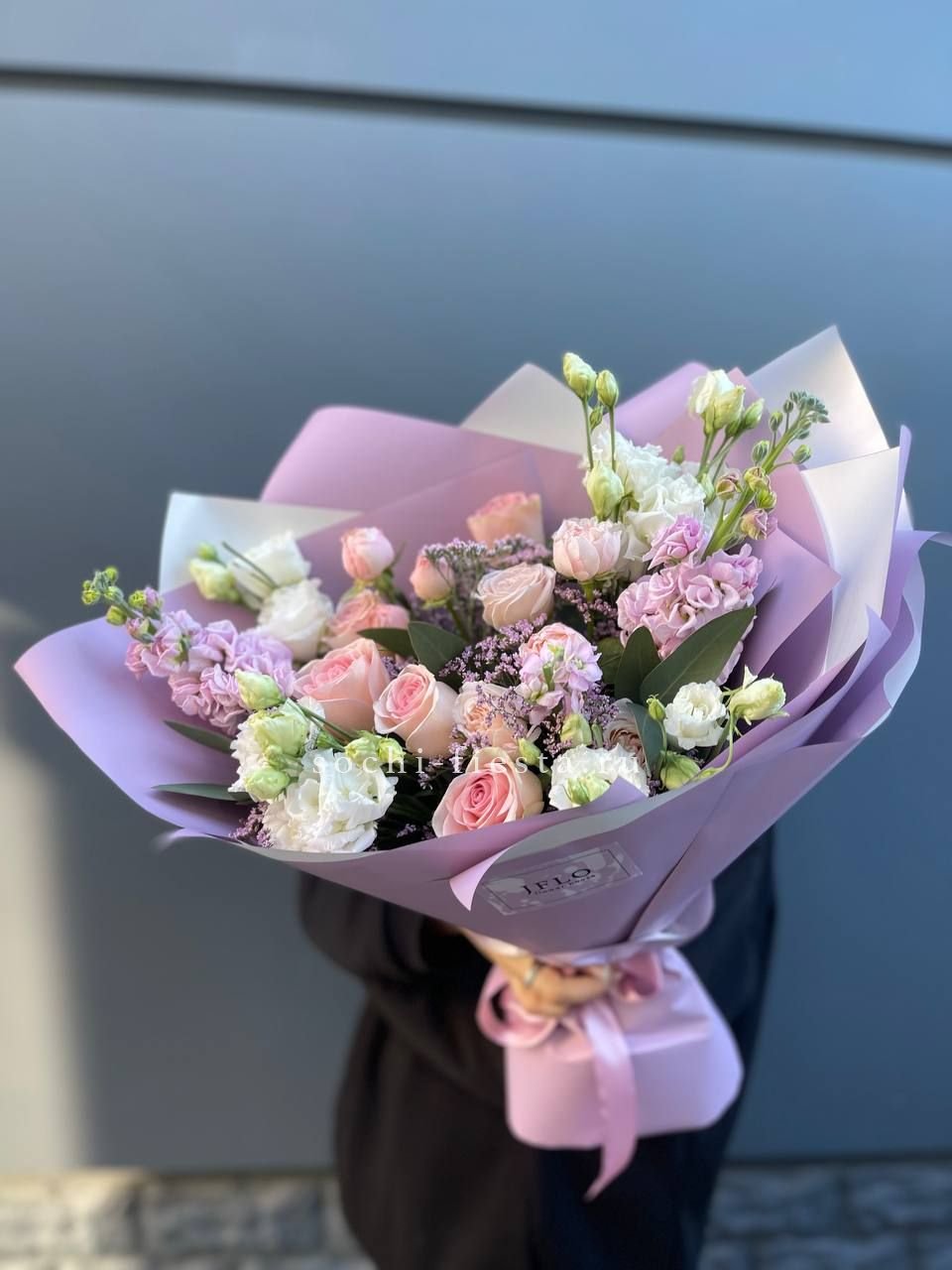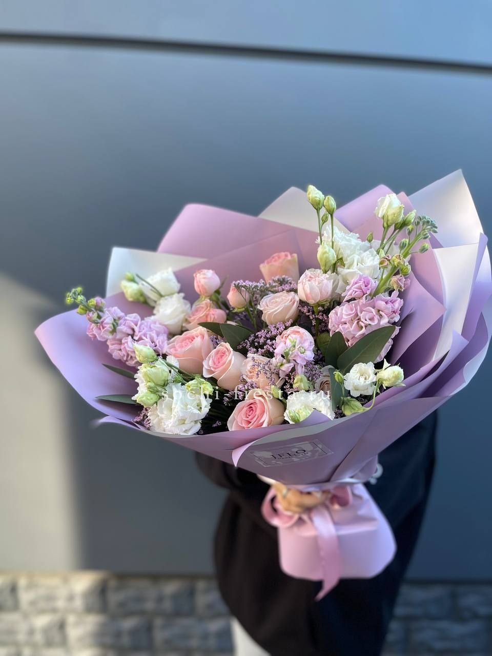 Монохромная палитра с многослойной структурой. Французские розы и эустомы чередуются с кустовыми бутонами, гортензии заполняют объём, а диантусы создают точечные акценты. Букет выглядит цельно и графично.