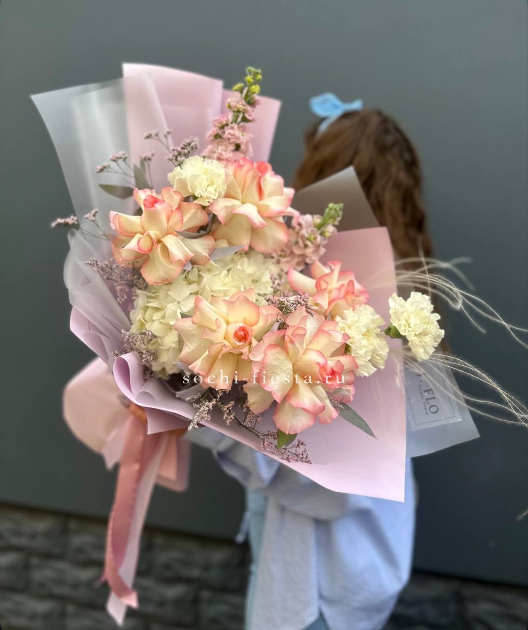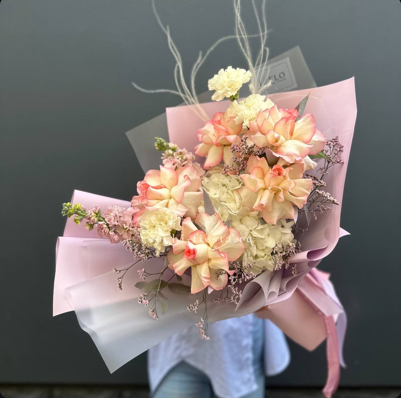 кустовые розы, гортензии, французские розы, диантусы, эустомы, лента и дизайнерская пленка.