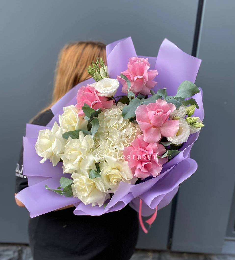 хризантема кустовая, гортензия, мисти баблс, розы в нежном оформлении.