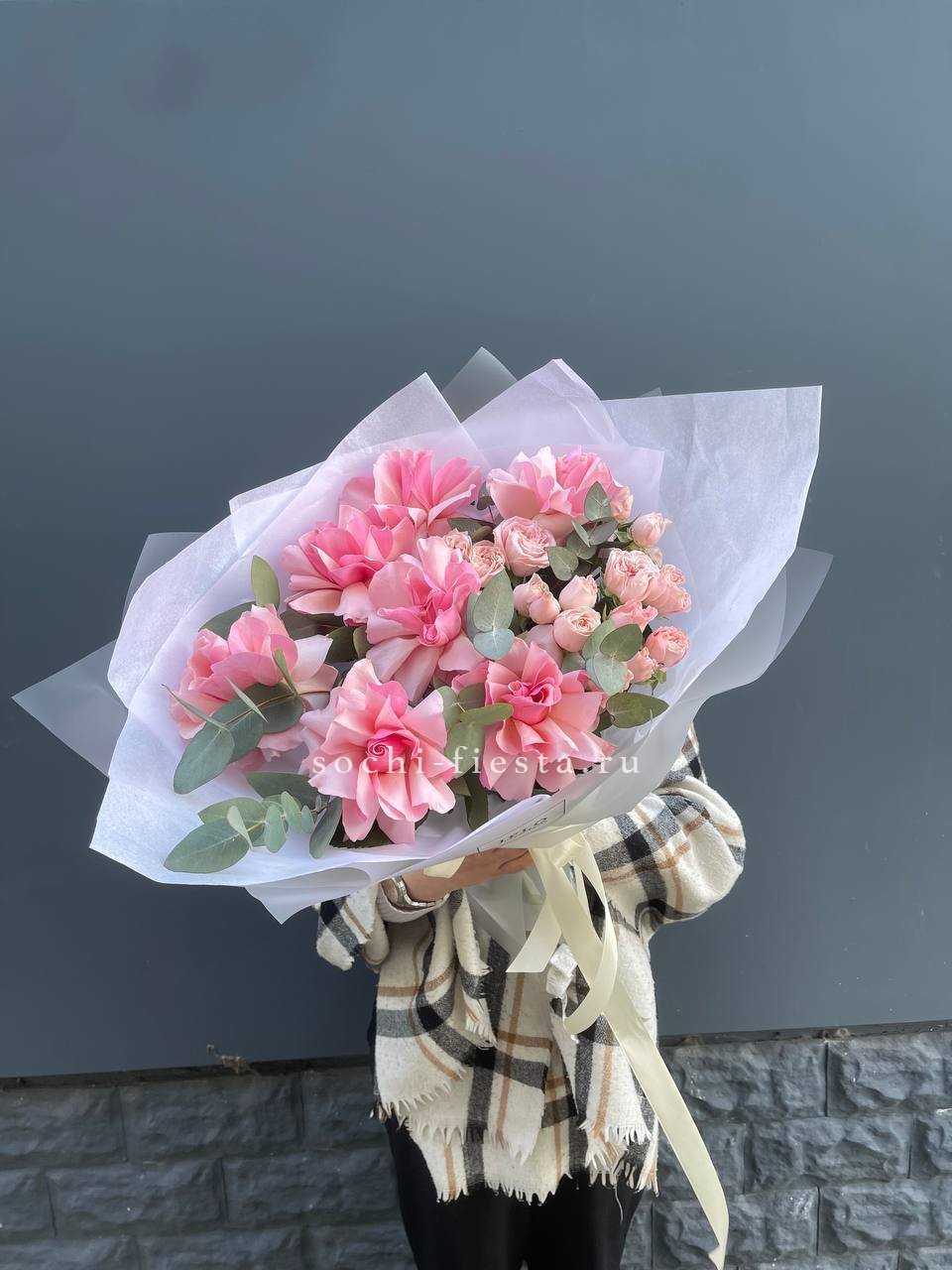 Пышный микс из гербер, хризантем и роз в обрамлении диантуса и статицы. Букет собран плотно, с яркими акцентами по всей форме. Озатамус и эвкалипт добавляют глубину и завершенность композиции.