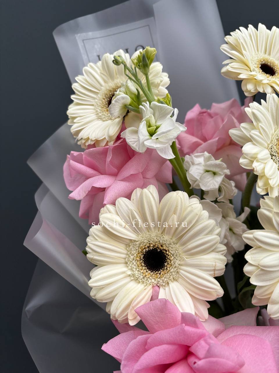 роза, герберы, дельфиниум (замена на маттиолу не в сезон), оформление.