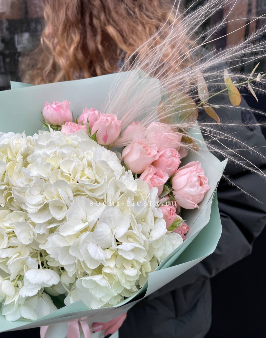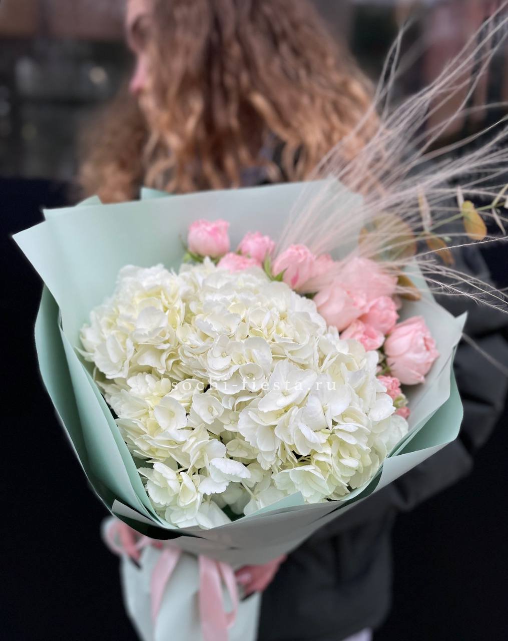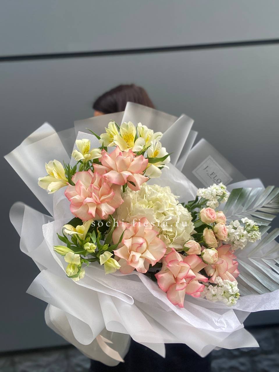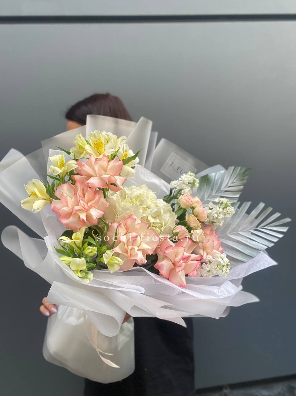 розы, гортензия, альстромерии, маттиола лента и дизайнерская пленка.