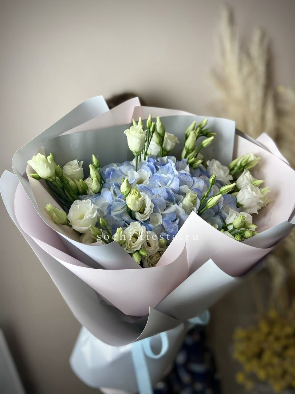 мисти баблс, гортензия, розовая роза, диантус, маттиола, эвкалипт, эустома в нежном оформлении.