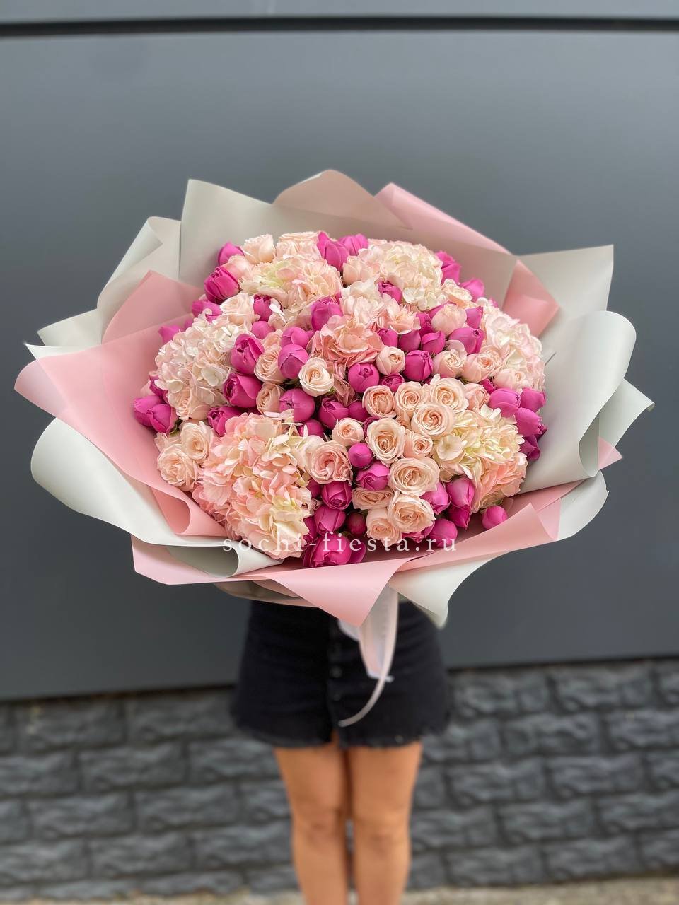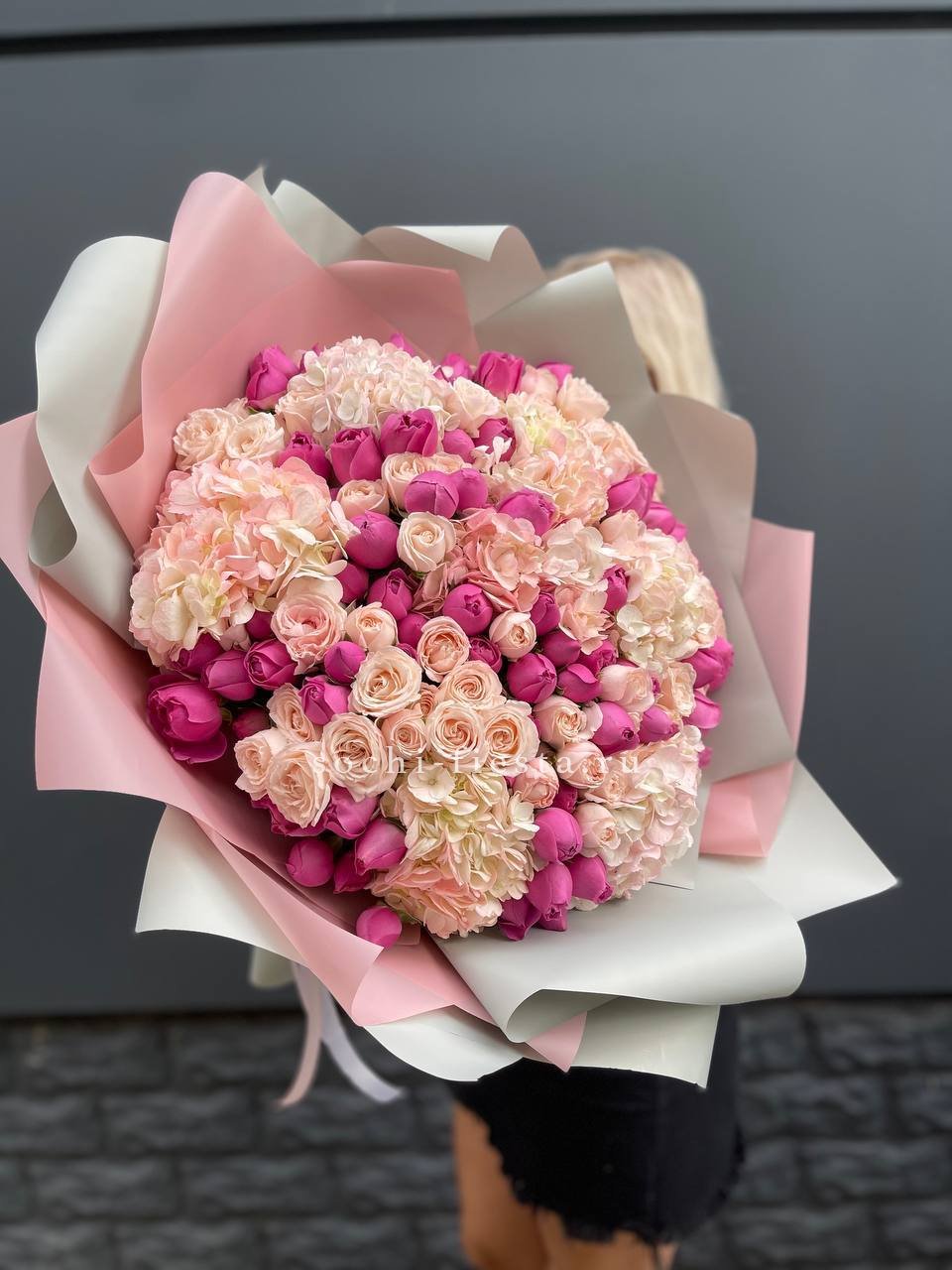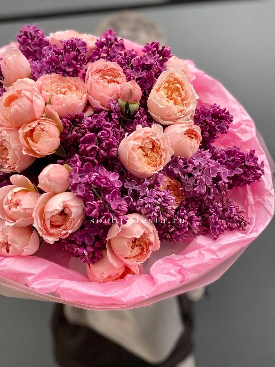 Весенняя встреча сирени и пионовидных кустовых роз в лёгкой упаковке. Ароматный дуэт для тех, кто ценит естественность и простоту.