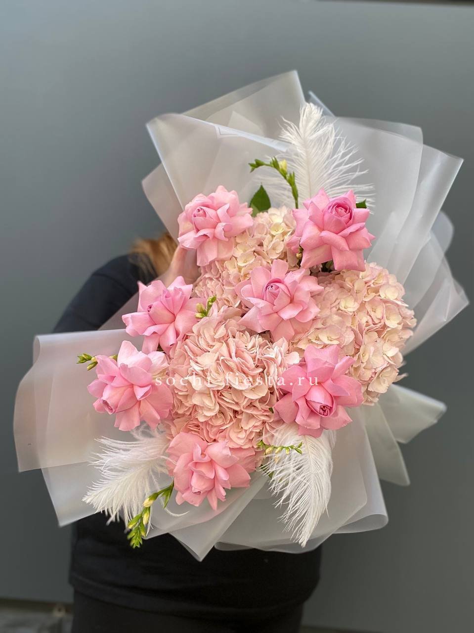 Этот пышный авторский букет напоминает нежное зефирное облако, в котором гармонично сочетаются объемные формы и изысканные оттенки. Композиция представляет собой микс из крупных соцветий гортензии и кустовых роз в пастельной гамме.