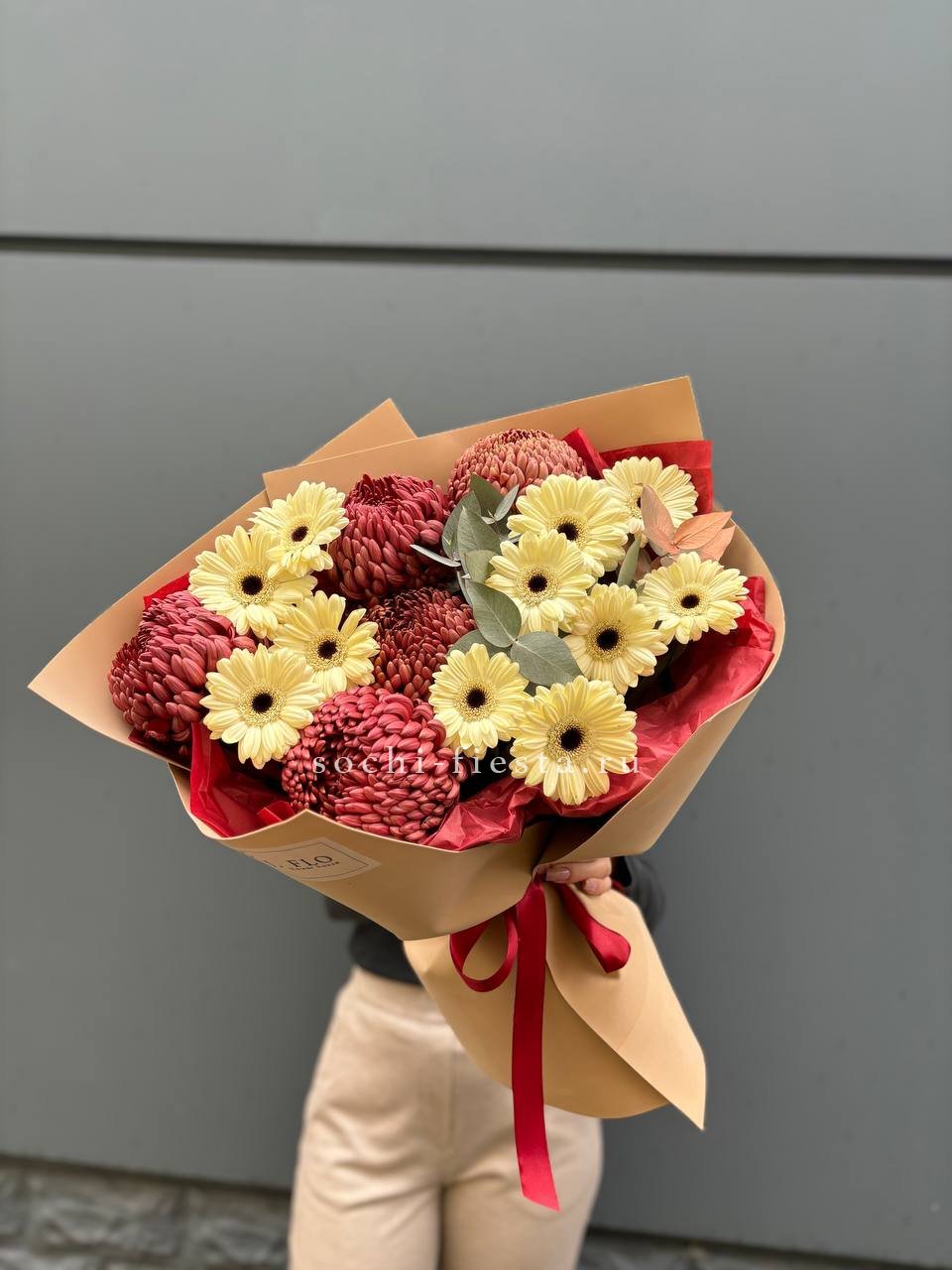 хризантемы Бигуди, герберы, эвкалипт, оформление.