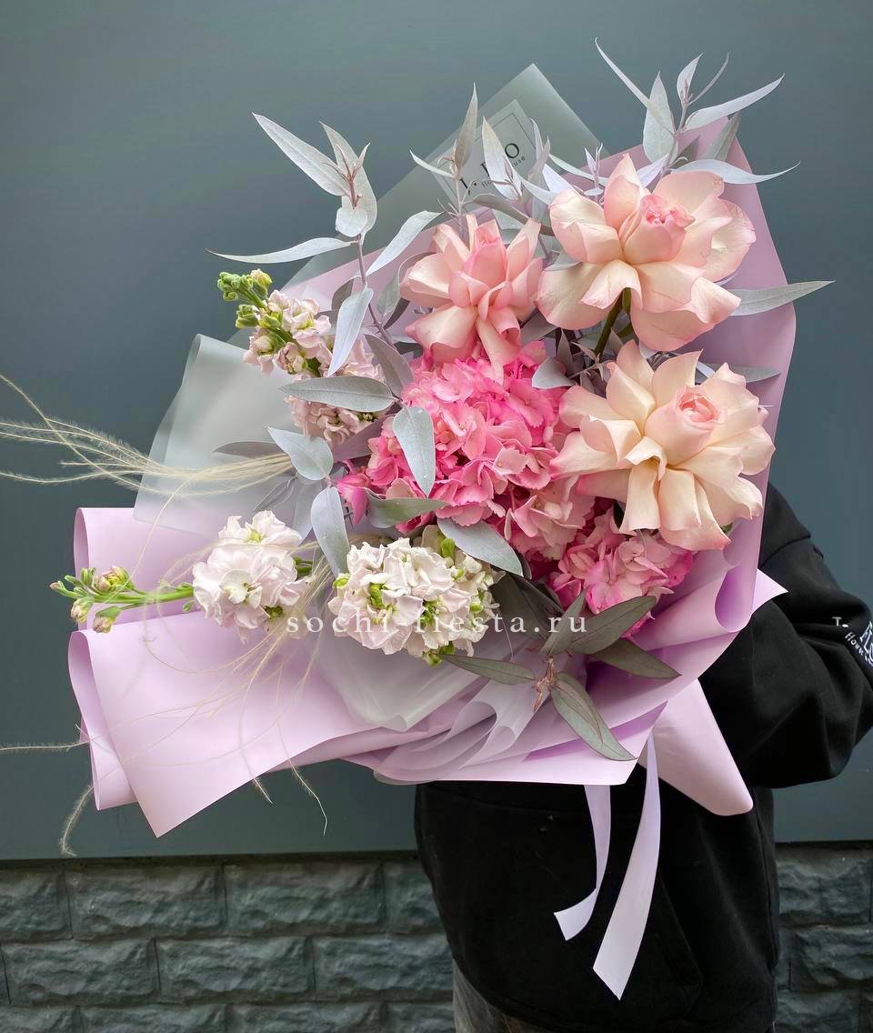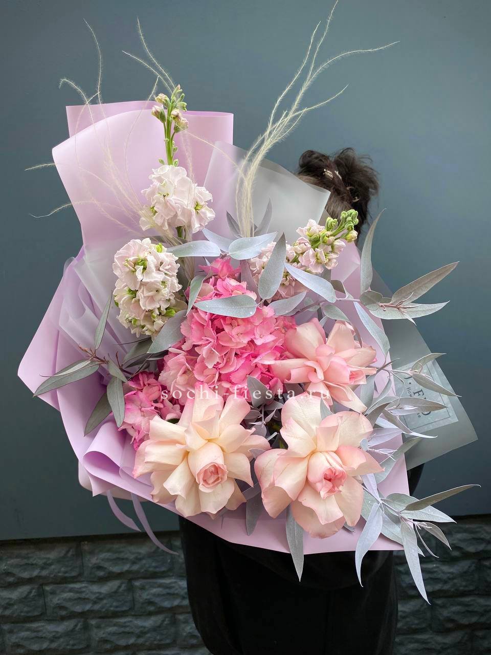гортензия, гвоздика, статица (или аналог), роза, эустома, дизайнерская пленка, лента.