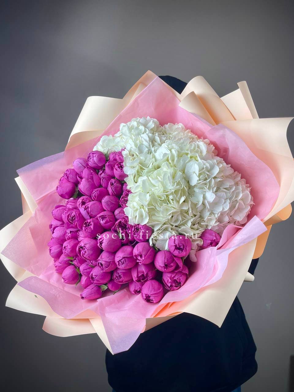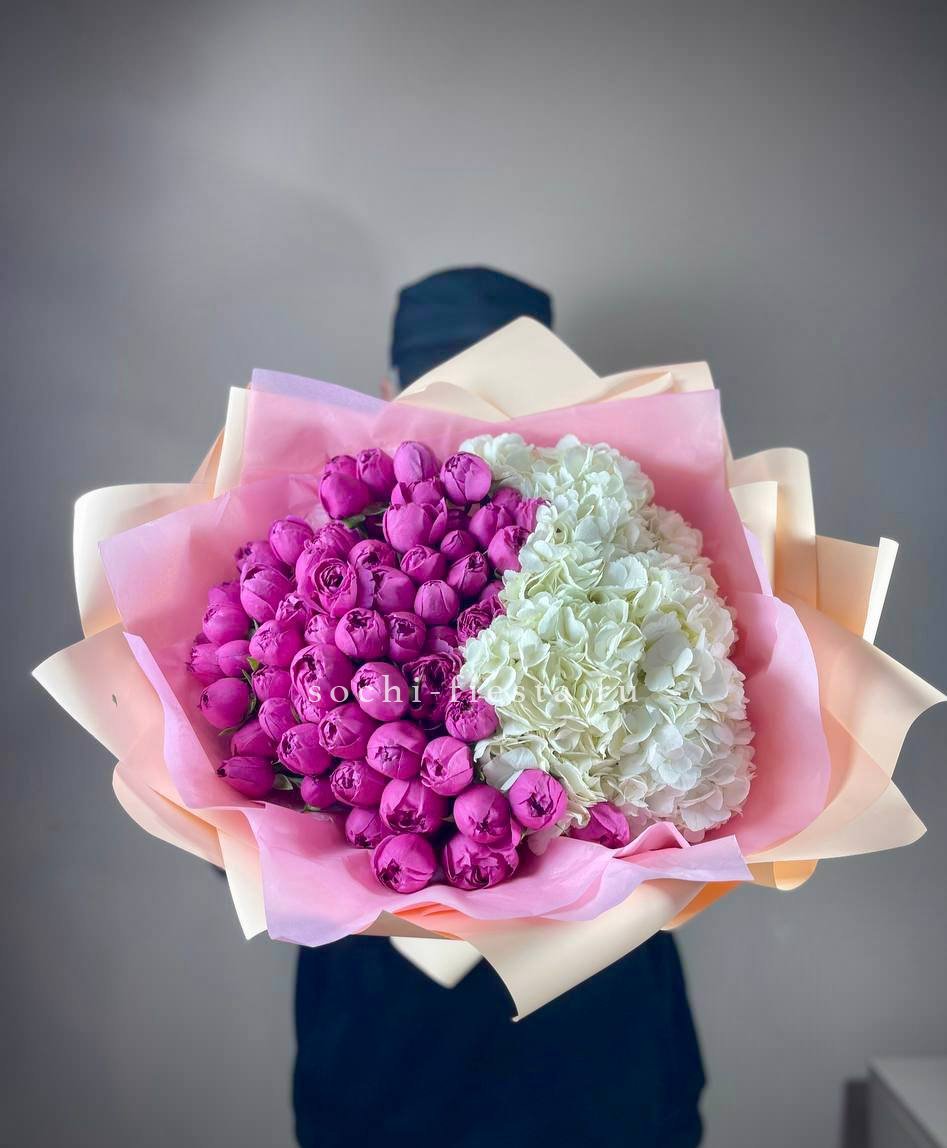гортензия, розы, диантусы, хризантема, пионы (или пионовидные розы), эустома, корзина. Состав может меняться, в зависимости от сезона.