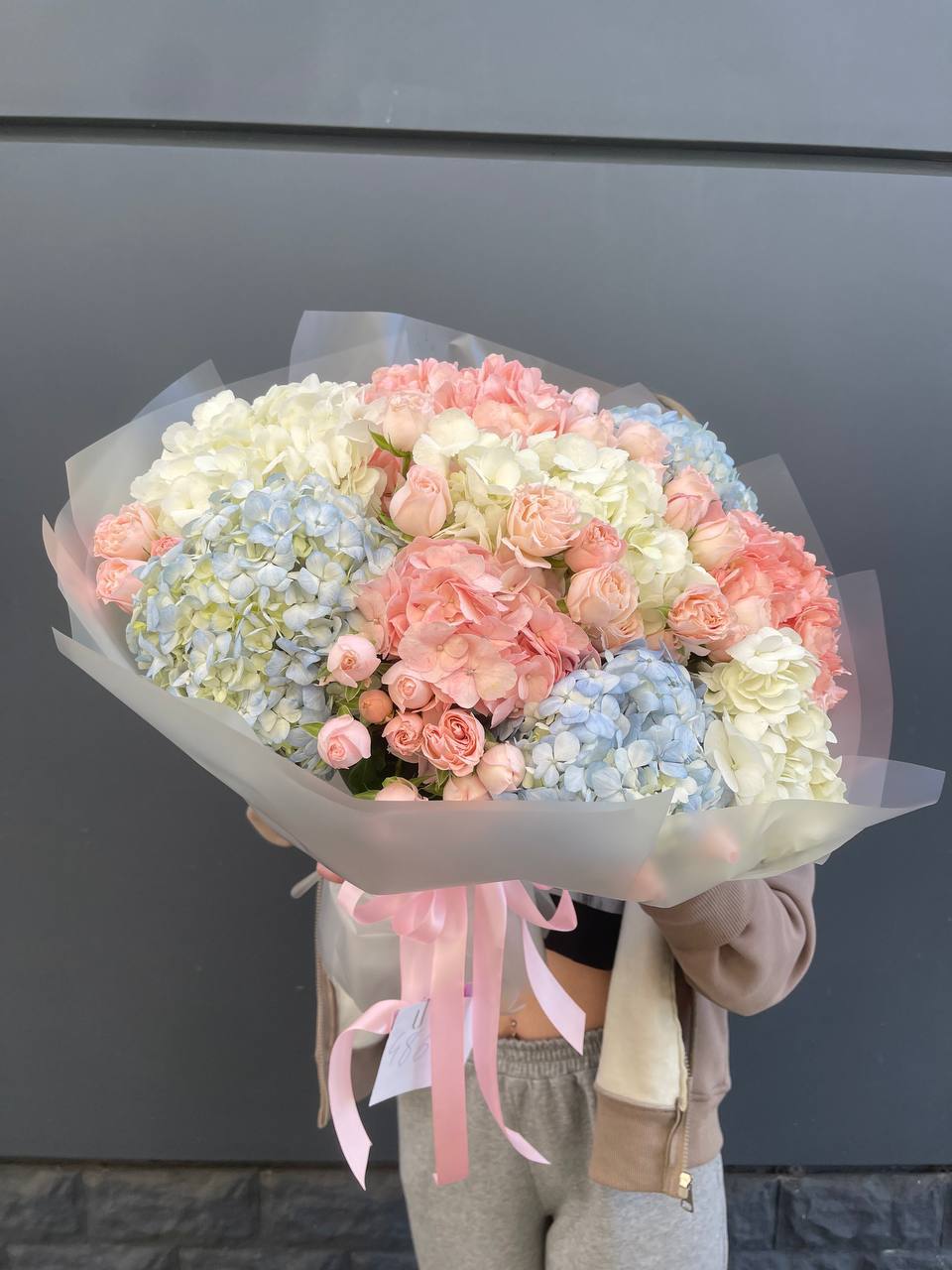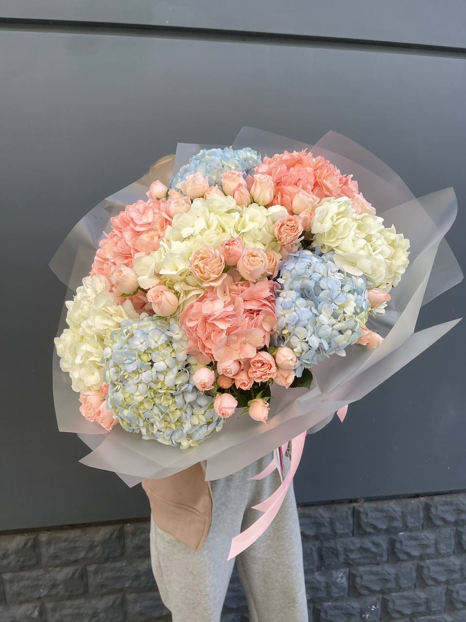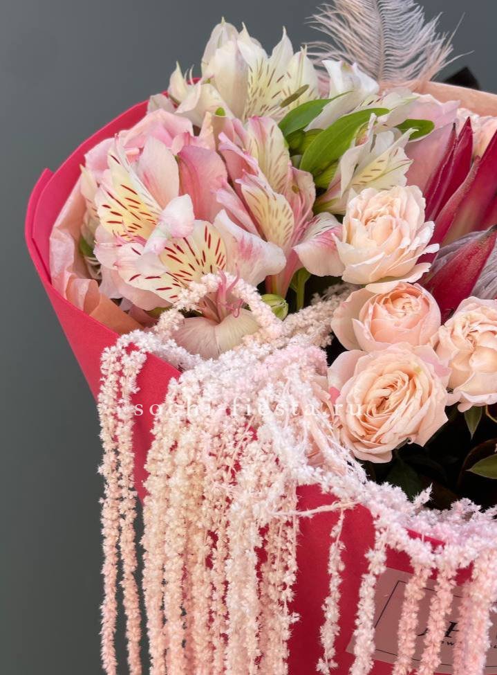 Воздушная гипсофила и струящийся амарантус создают движение вокруг крупных соцветий гортензии и роз Джумилия. Композиция построена на игре объемов и лёгкости линий.