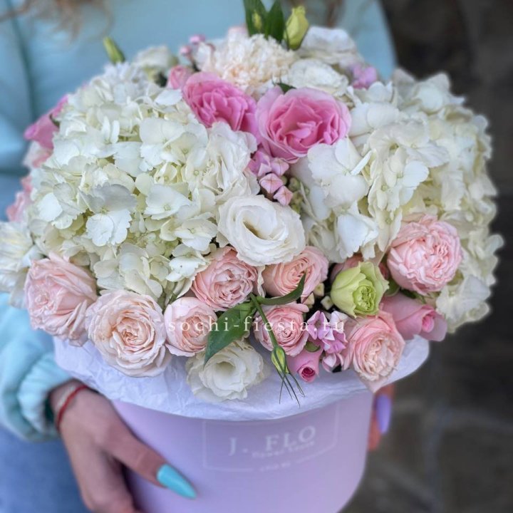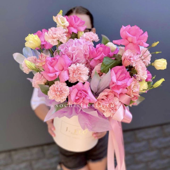 • Шляпная коробка с розами и гипсофилой — универсальный подарочный формат.