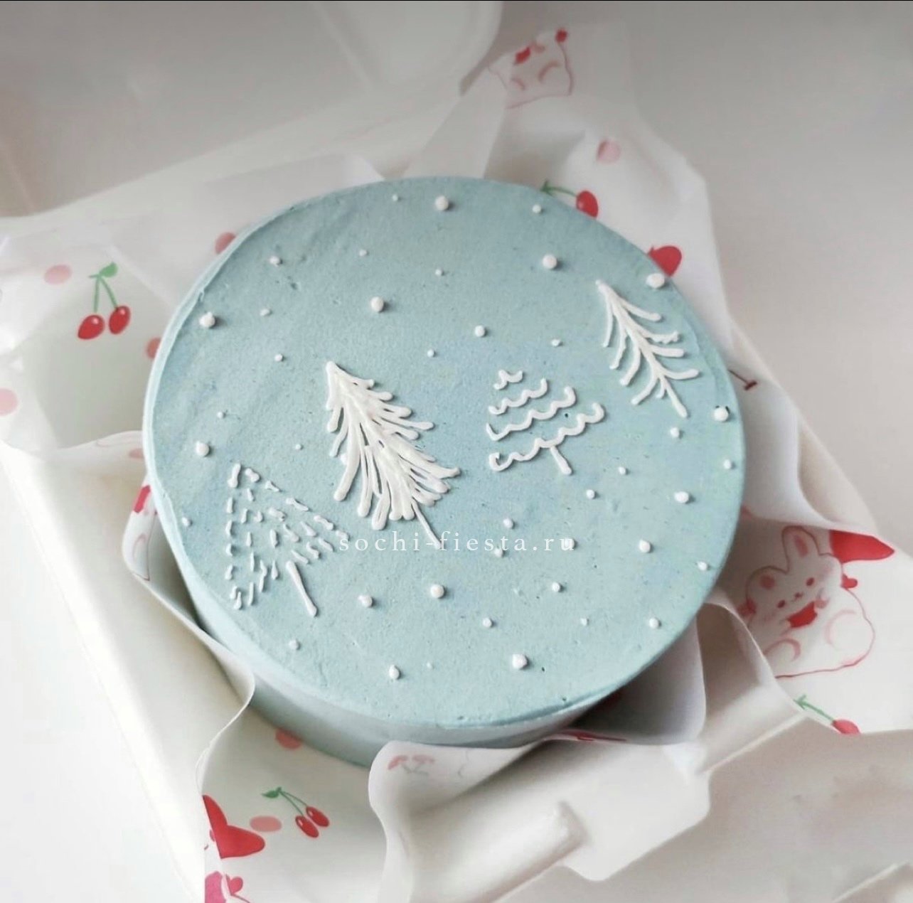 Зимний дизайн с силуэтами елей создает графичную композицию на поверхности крема. Три варианта начинки расширяют выбор под разные вкусовые предпочтения.