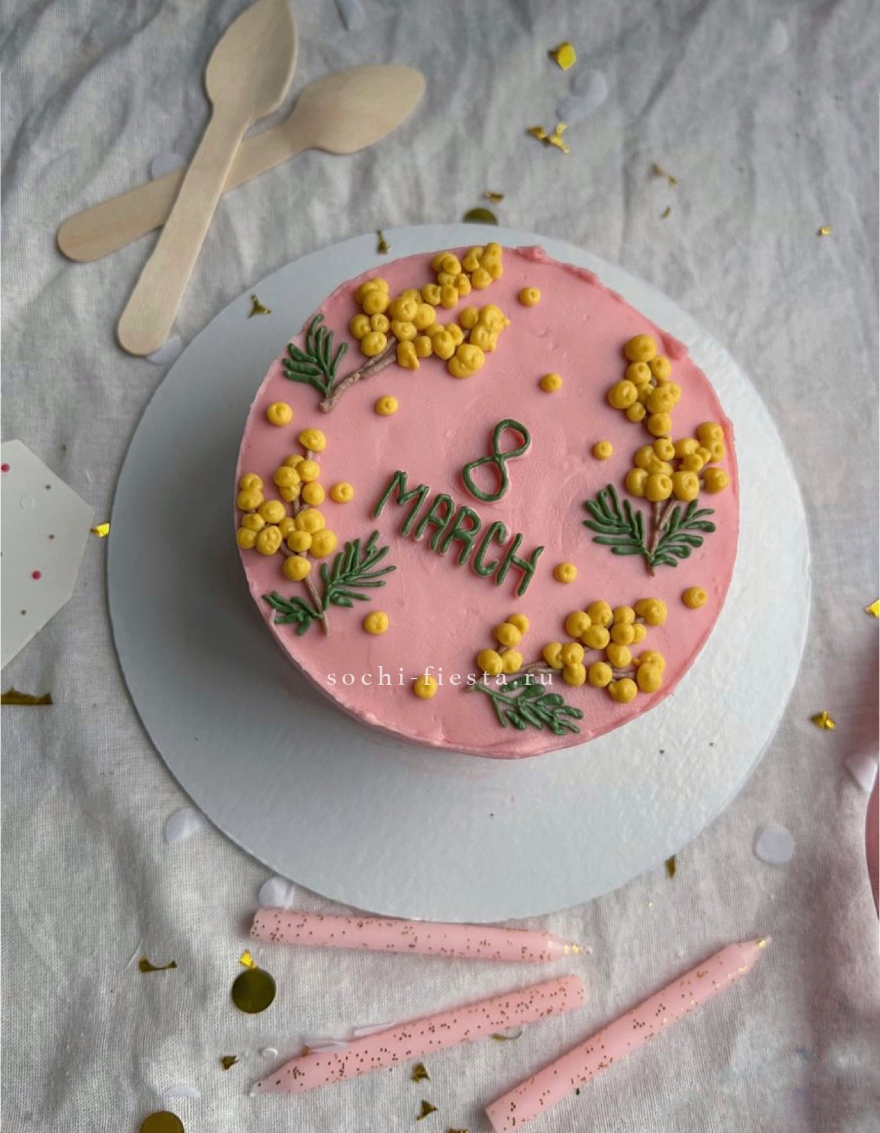 Майская тематика раскрыта через персональную надпись и дизайн кремовой поверхности. Торт выглядит цельно, декор не перегружает композицию. Формат подходит для камерного чаепития.