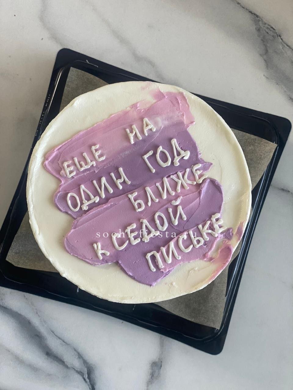 Сиреневый крем с россыпью шоколадных драже и волнистыми деталями создает игривое настроение. Два яруса с плавными линиями и яркими акцентами. Ручная работа с выбором вкуса.